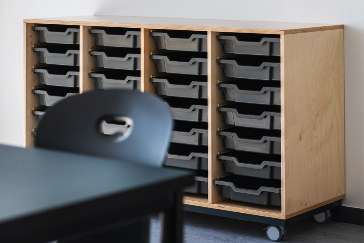 Vi har indrettet skolens klasselokaler i samarbejde med Københavns Kommune, hvor vi har haft fokus på en bæredygtig indretningsløsning med multifunktionelle, flytbare og holdbare møbler. Alle klasser har fået borde med støjreducerende linoleumstop, og vi har udstyret skolen med en masse materialevogne på hjul, som skal fungere som flyveelementer og gøre brugen af lokalerne mere fleksibel.