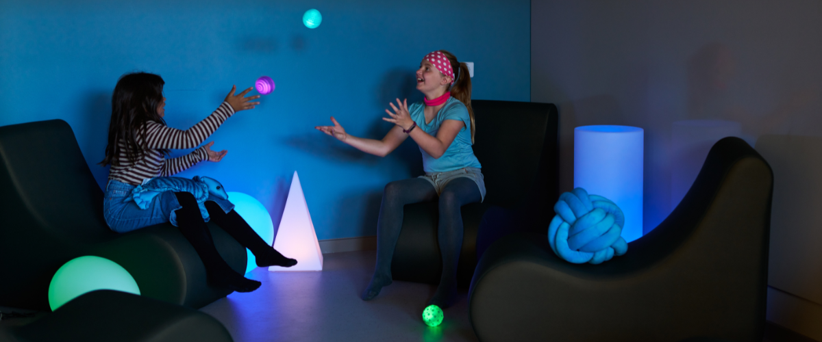 I afdelingens fællesområde er der ligeledes lagt vægt på møbler og inventar som giver rumopdeling til ophold i mindre grupper. Der er også indrettet et sensorisk rum, hvor farvet belysning og kompenserende redskaber bidrager til sansestimulering og stressaflastning.