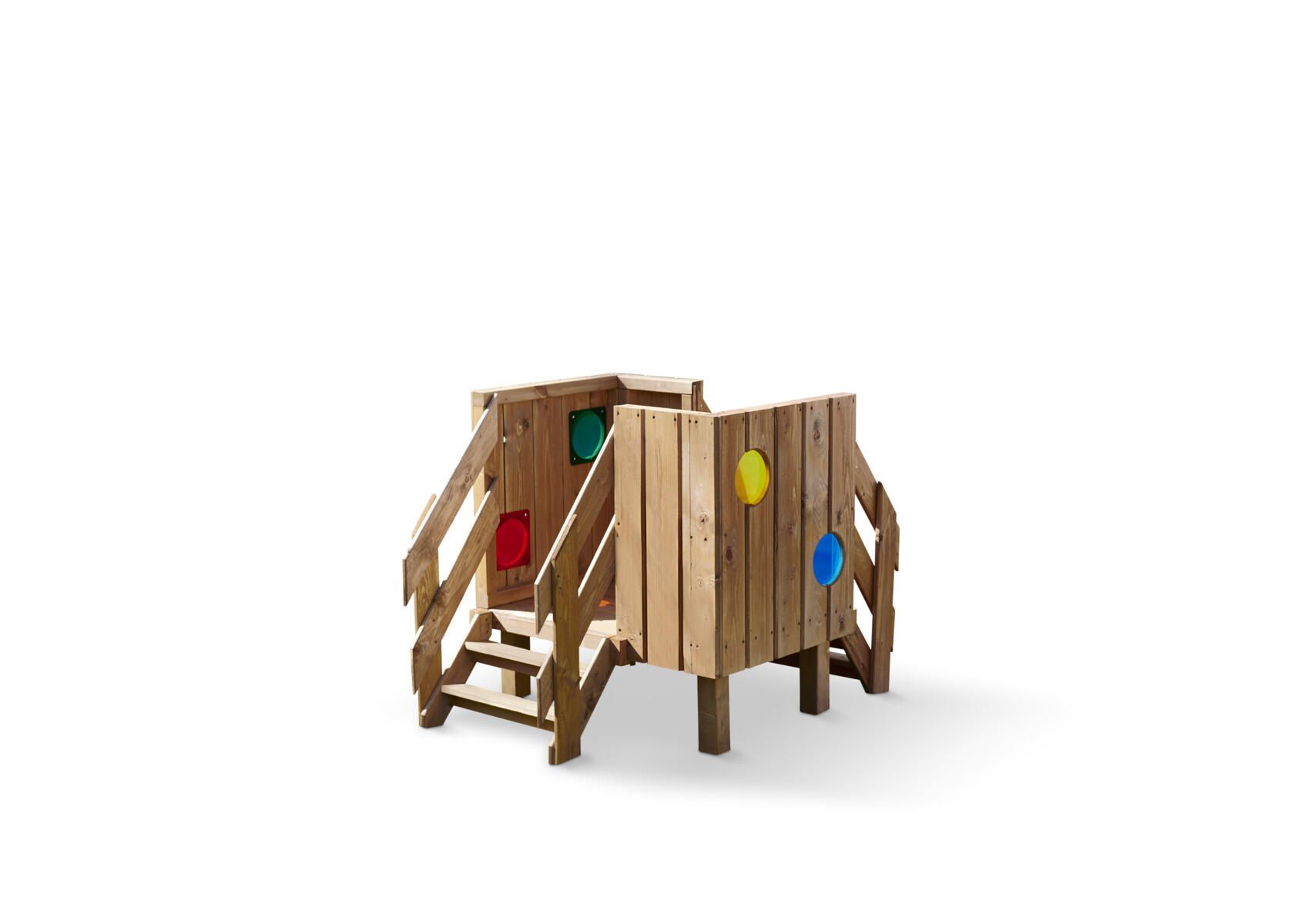 Dette sensoriske tårn er ideelt til at fremme børns grovmotoriske udvikling, koordination og balance. Det tilbyder timevis af leg og bevægelse i udemiljøet og fungerer som et alsidigt element, der let kan integreres i rolleleg. Tårnet stimulerer børnene til aktiv og underholdende leg, mens de løber rundt og udforsker de spændende kighuller. Når lyset brydes gennem det farvede plexiglas, skabes der fantastiske sensoriske oplevelser, som stimulerer det visuelle sanseapparat. Børnene kommer op på platformen via to trapper med gelænder. Fremstillet af FSC-certificeret fyrretræ, som er overfladebehandlet med en vandbaseret lak. Til jordforankring kræves 4 stk af 161297, eller 151133 til overflademontering. Leveres usamlet.