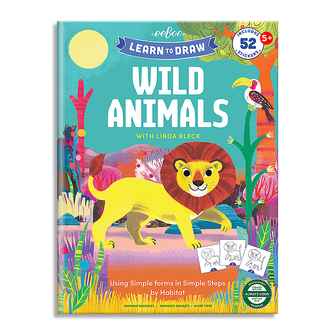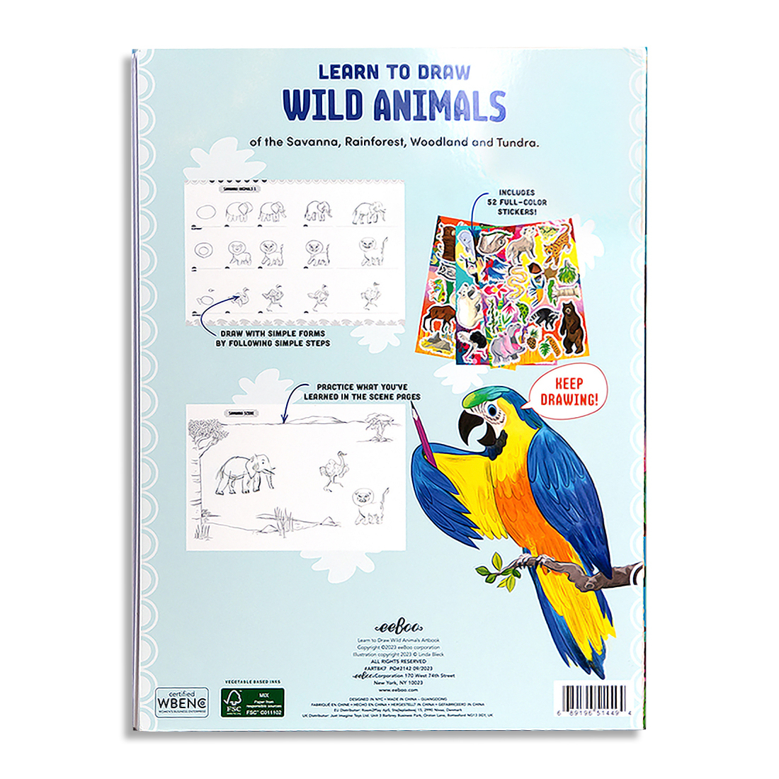 En bog med enkle instruktioner i, hvordan man tegner forskellige vilde dyr. Indeholder illustrationer, der viser trin for trin, samt plads til at øve. Indeholder også 50 farverige klistermærker med de forskellige dyr og billeder af forskellige områder, hvor de kan placeres. Engelsk tekst. 32 sider.
