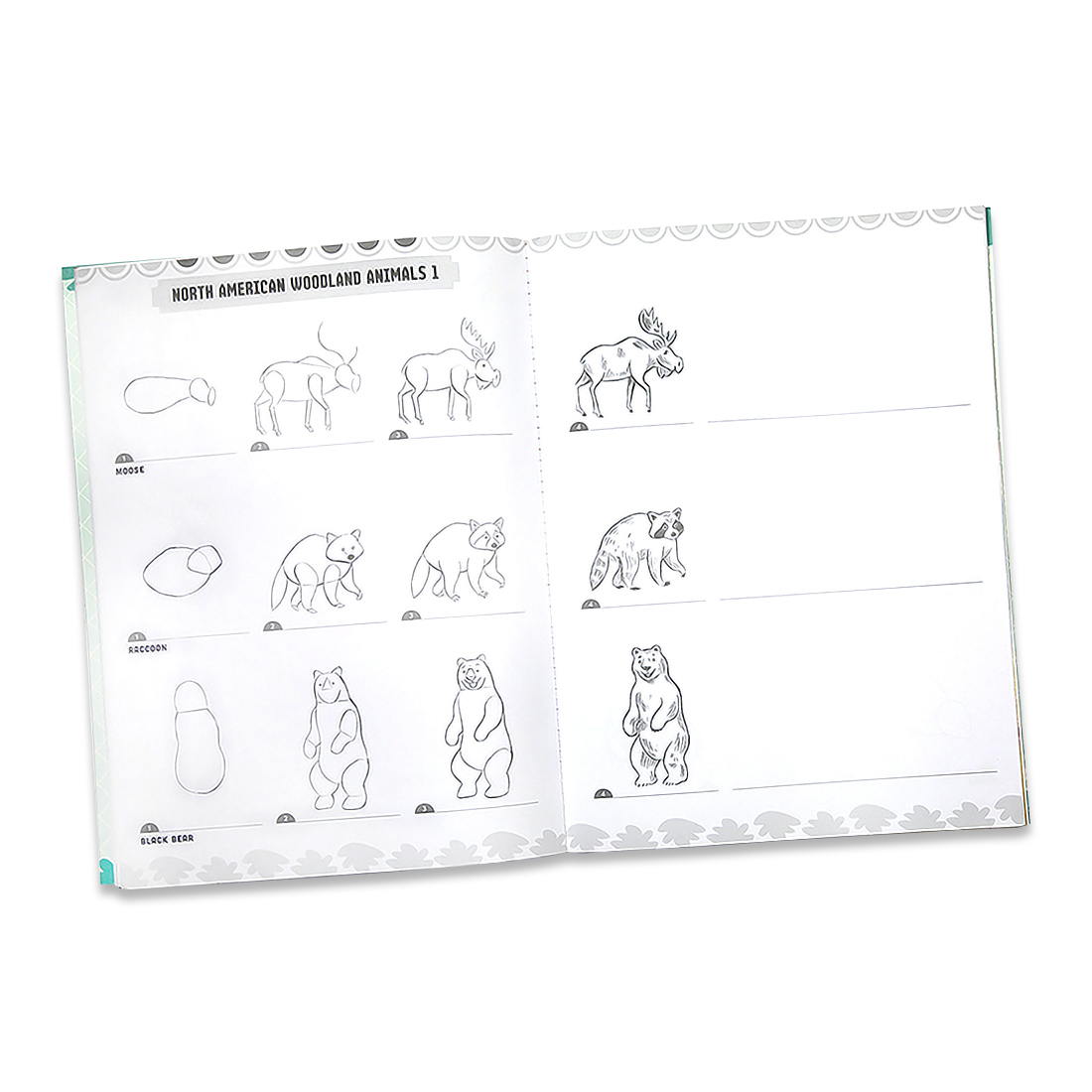 En bog med enkle instruktioner i, hvordan man tegner dyr. Forskellige dyr i bevægelse eller fra forskellige vinkler. Indeholder illustrationer og tekst, der viser trin for trin, samt plads til at øve. Engelsk tekst. 32 sider.