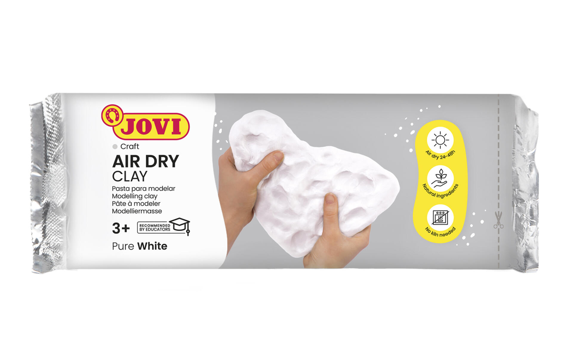 1 kg/pk. Hvid lufttørrende og selvhærdende modelleringsmasse. Klar til brug. Let at bearbejde med hænderne og størkner efter nogle timer i stuetemperatur. Gennemtørrer 1 cm i døgnet, hvilket betyder, at leret ikke skal brændes. Kan efter tørring males og lakeres. Leret krymper forskelligt afhængigt af rumtemperaturen og underlaget det placeres på. Glutenfri. PVC-fri. Fra 3 år.