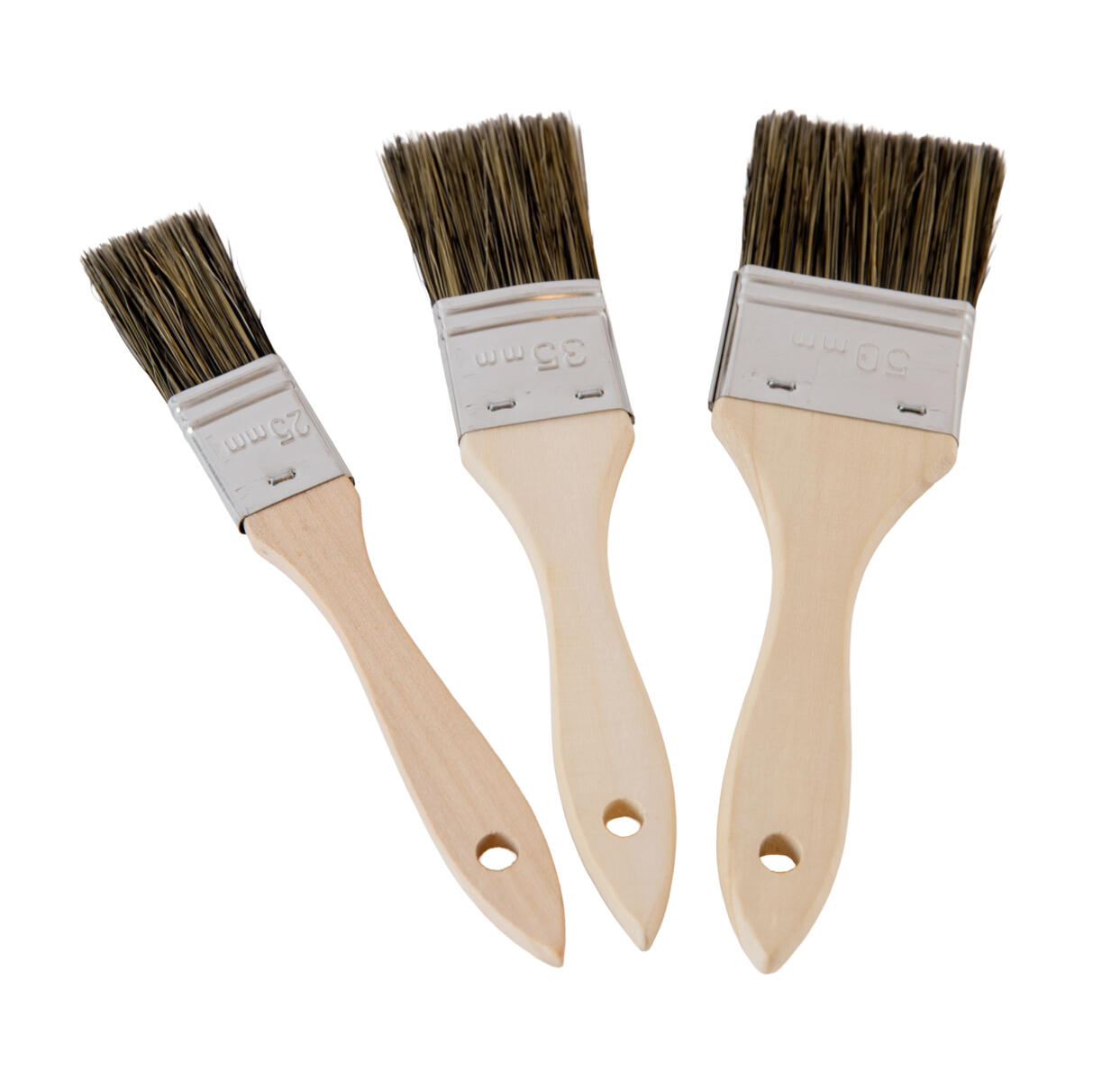 18 stk./pk. Flade børstepensler i forskellige størrelser. Kort, ulakeret træskaft. 2 stk. af hver størrelse 6, 8, 14 og 18 og 5 stk. af hver størrelse 10 og 12.