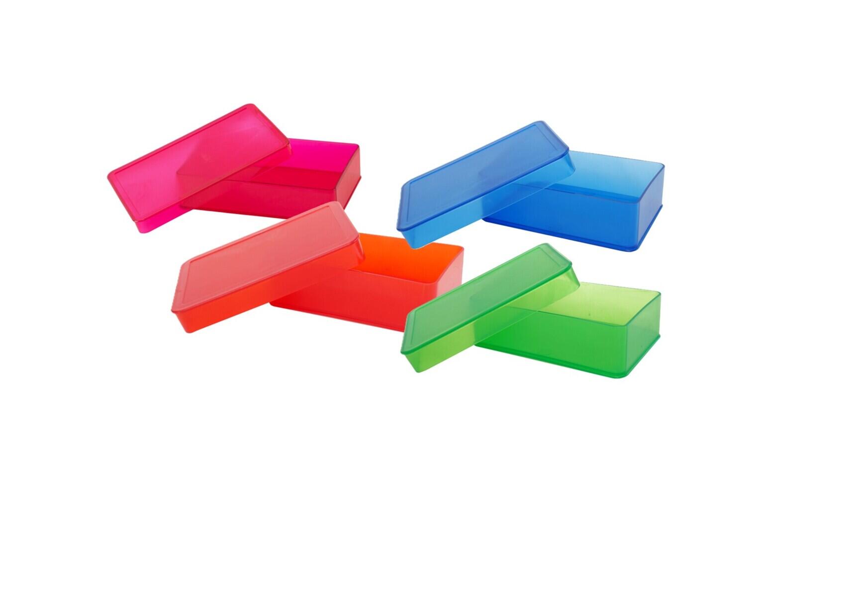 Transparent opbevaringskasse med låg med 6 farvede indsatser. (2 gule, 2 blå og 2 rosa). Perfekt opbevaring til flere ting i en og samme opbevaringskasse. Af polypropylenplast. Mål 40x30x18 cm.