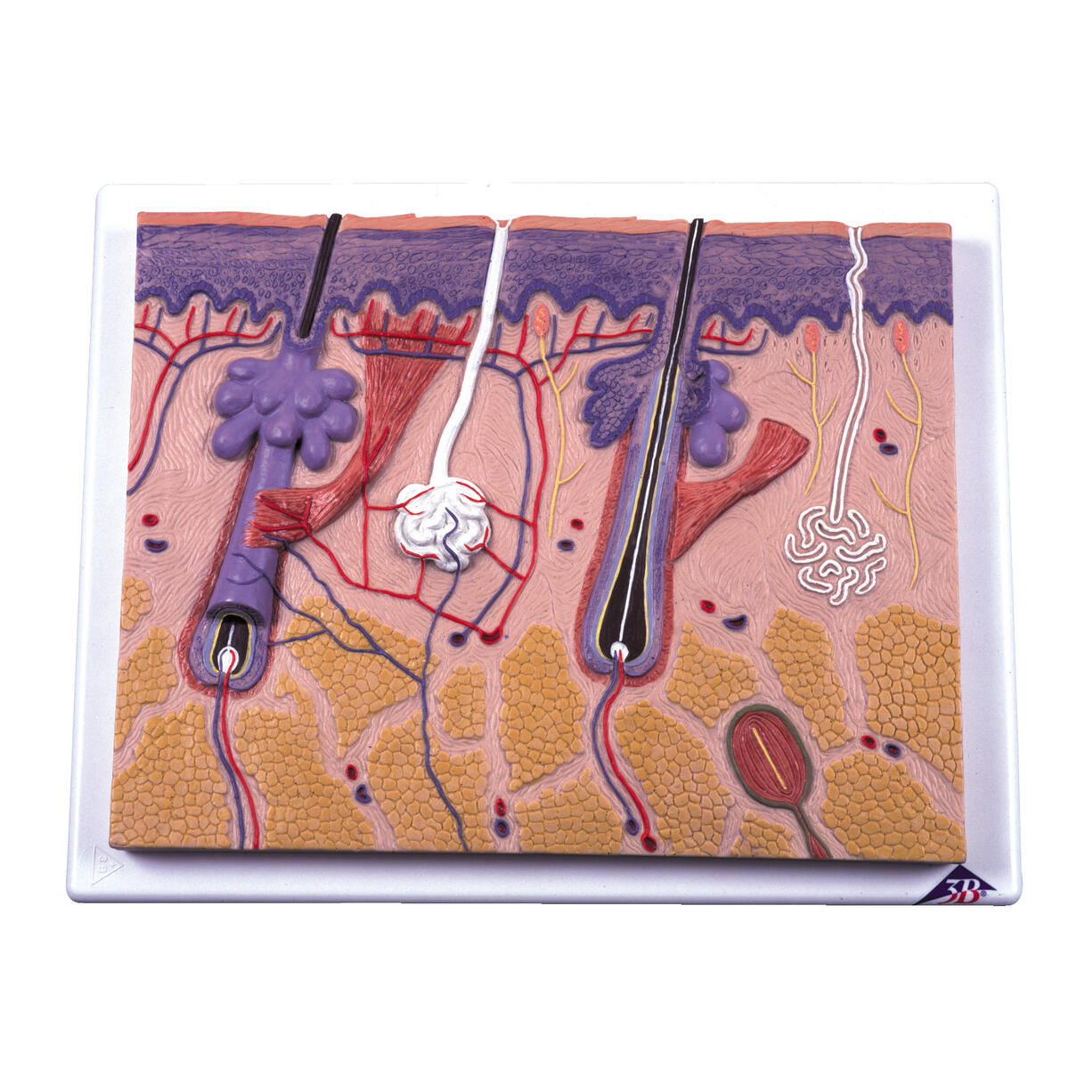 70x virkelig størrelse. Denne model viser et udsnit af huden; hudflager, hårrødder, svedkirtler. Mål 26x33x5 cm. Af plast.