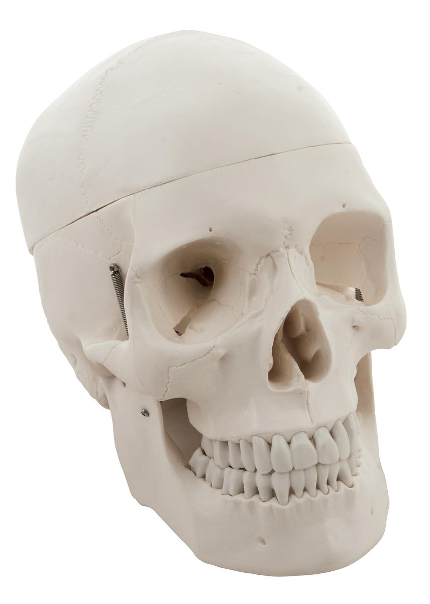Anatomisk model af skelet med over 600 håndnummererede, mærkede detaljer, herunder håndmalede muskeloprindelser og -indsætningspunkter, fleksibel rygsøjle og ledbånd, fremspringende spinalnerver og vertebrale arterier og tredelt kranie med individuelt indsatte tænder. Leveres med metalstativ (aftageligt) og gennemsigtigt støvdæksel.