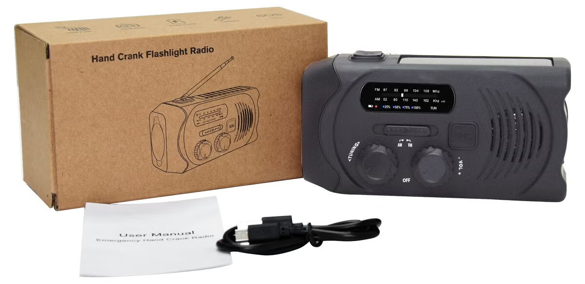 Dynamoradio til udendørs brug og nødsituationer. Oplades via håndsving, solcelle eller USB og kan fungere som nødlader til mobil via USB-A. Udstyret med blinklys og SOS-knap. Batteriet kan forudlades via USB og vedligeholdes af solceller. Kapslingsklasse IPX3 – tåler let regn.