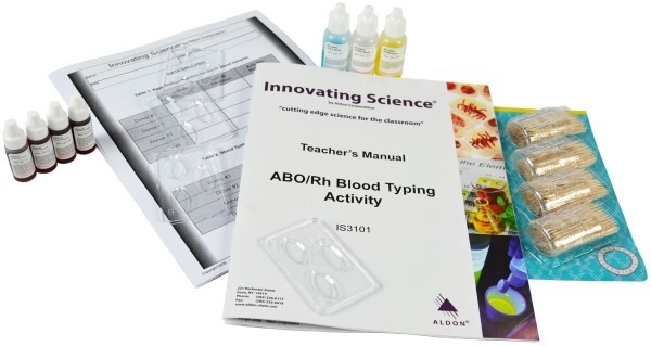 Sæt til simulering af blodtypebestemmelse. Eleverne tester og fastlægger ABO/Rh-blodgrupper for fire simulerede blodprøver. Ved hjælp af simuleret blod kombineres prøver og antiserum, hvorefter resultaterne observeres. Ingen tandstikkere, omrøring eller ventetid nødvendig. Indeholder materiale til 10 grupper. Lærervejledning og kopimateriale til elever medfølger (engelsk). Flasker i PE, bakke i akrylplast.