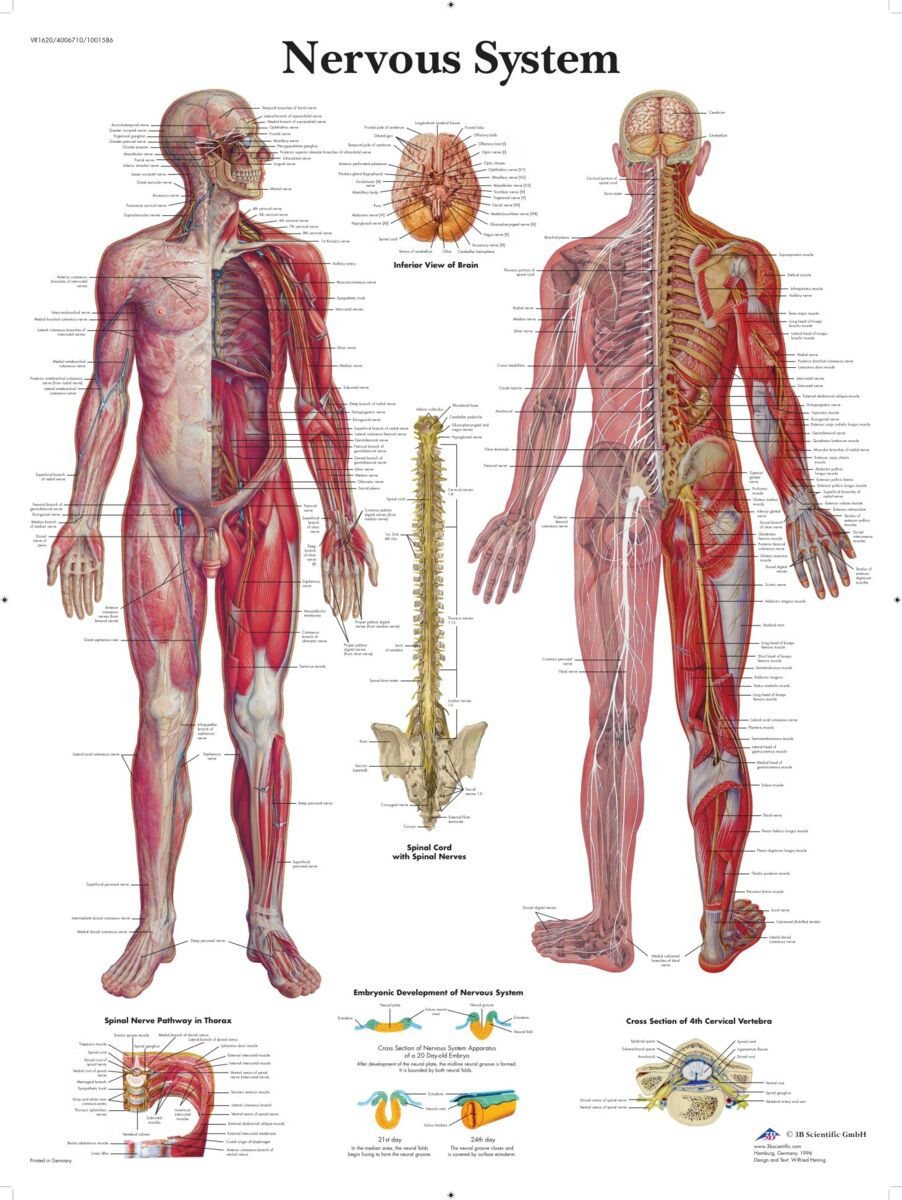 Lamineret anatomisk plakat af det menneskelige nervesystem med farverige detaljer. Plakaten viser hele nervesystemet, inklusive hjernen og rygmarven, og er et rigtig godt supplement til sundhedsklinikker og klasseværelser. Trykt på 200 g UV-bestandigt papir og lamineret (75 µm) på begge sider, hvilket gør den robust og sikrer, at den ikke falmer i solen. Lamineringen gør det også muligt at skrive på overfladen med ikke-permanente tuscher. Engelsk tekst.