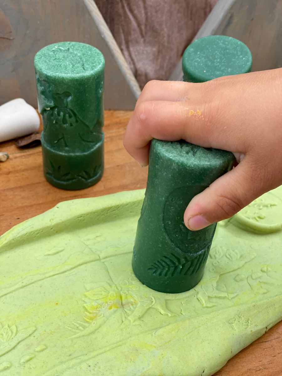 6 stk./pk. Rul i ler eller sand og stempel langs siden for at frembringe de indgraverede motiver. En kreativ måde for børn at udforske dinosaurer og hvor de levede. Sættet indeholder: Tyrannosaurus rex og et brølende hoved, Spinosaurus og en forhistorisk fisk, Diplodocus og et forhistorisk miljø, Triceratops og vulkansk landskab, Stegosaurus og rygstykker og dinosauræg. Mål: 72x34 mm. Lavet af sten- og harzblanding, der gør dem velegnede til både indendørs og udendørs brug. PVC-fri. Fra 2 år.