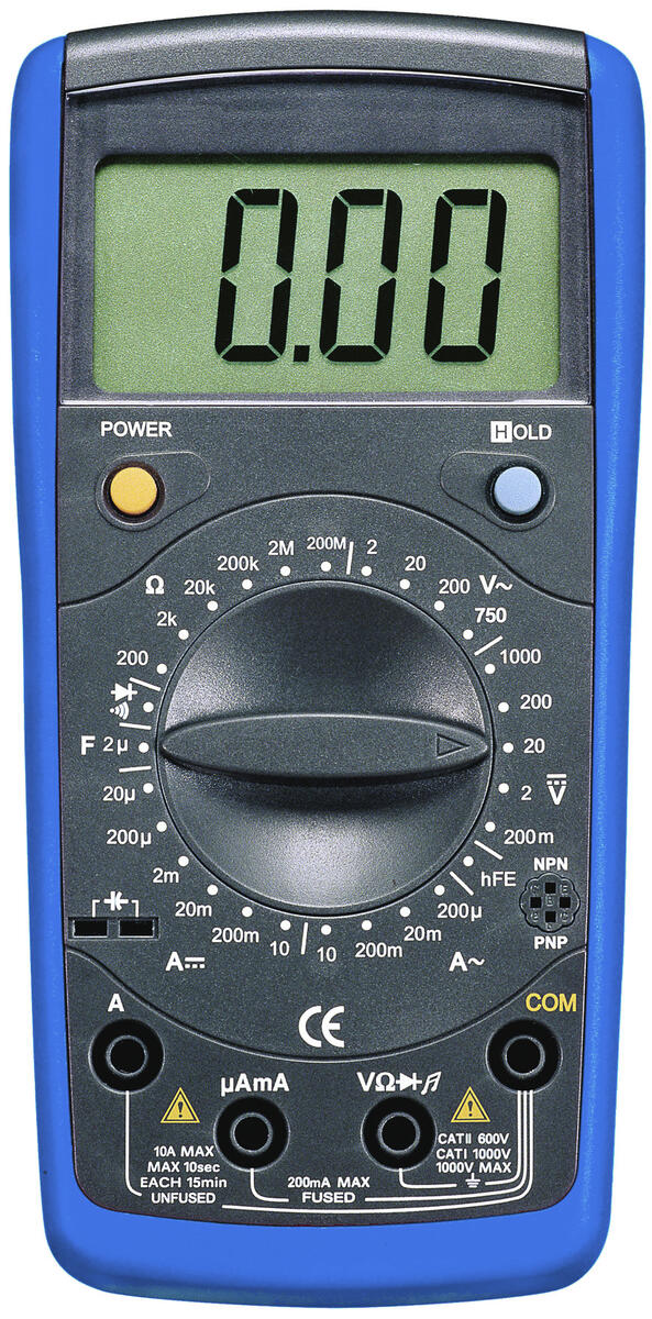 Dette analoge søjlediagram og instrument måler spænding, strømstyrke, modstand og har en diode-tester med valgtfrit lydsignal. "Auto power off"-funktionen slukker strømmen efter ca. 10 minutter. Instrumentet har en "batteri lavt"-indikator og er derudover forsynet med et automatisk lydsignal ved fejlagtig tilslutning for at mindske risikoen for skader. Manuel eller automatisk valg af intervaller, automatisk polaritet og "uden for rækkevidde"-indikator. Leveres komplet med sensorer, kabler, instruktioner, beskyttelseshætte og batteri. Display: 3 ½ cifre. Max 600V, 10A, 32 MOhm. Mål: 147x70x39 mm. Vægt: 390 g.