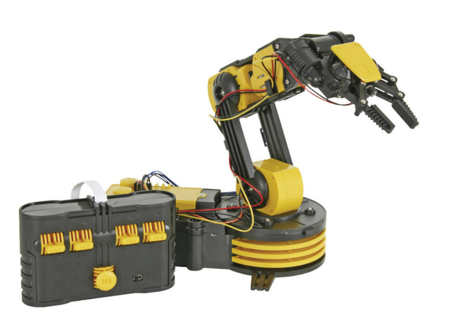 Whadda KSR10 er et pædagogisk byggesæt til en fuldt fungerende robotarm med 5 motorer og 5 led. Giver forståelse for grundlæggende mekanik, elektronik og robotteknik. Den færdige arm har roterende base, bevægelig albue og håndled samt gribeklo, der kan løfte op til 100 g. Indbygget LED-lampe til arbejde i mørke. Fremstillet i slidstærk ABS, 196 dele. Færdig enhed: H 38 cm, D 22,85 cm, B 16 cm, vægt 660 g. Drives af 4 × LR20, ingen lodning eller erfaring krævet. Fra 14 år.