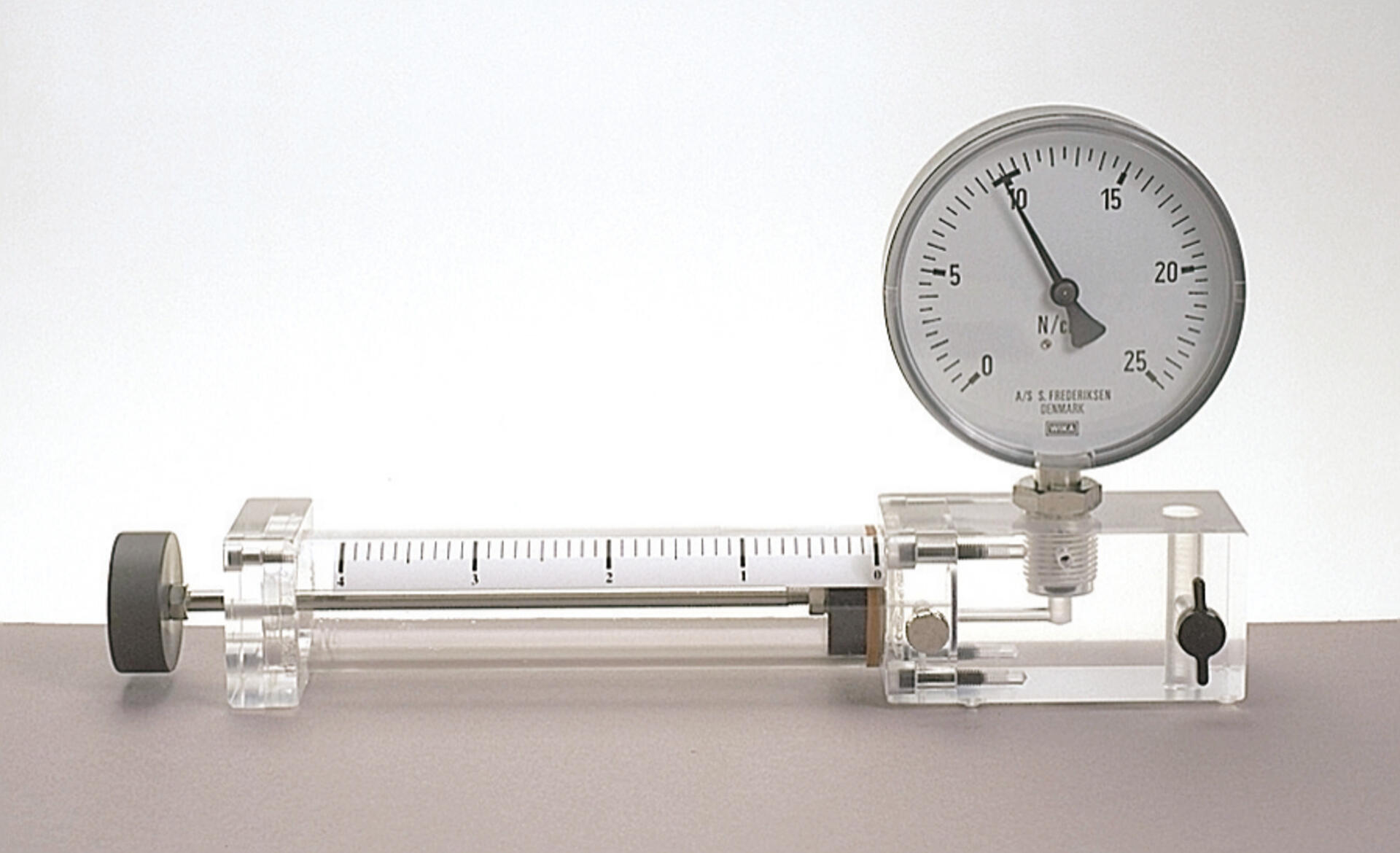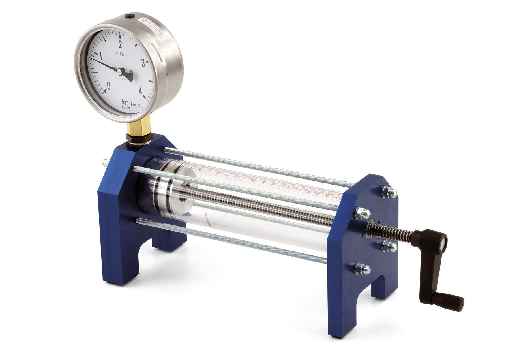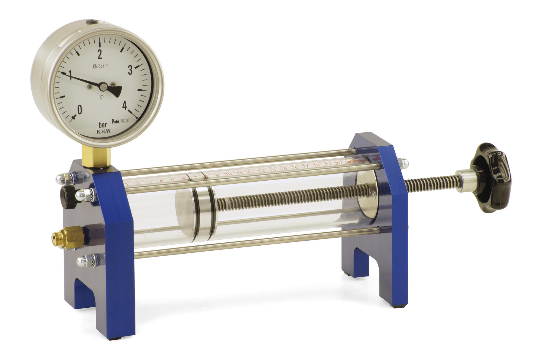 En demonstrationsanordning bestående af en lukket plexiglascylinder med et glidestempel, der bestemmer det lukkede volumen i cylinderen. Stemplet bevæges ved at dreje en gevindstang med et håndsving. Trykket i cylinderen kan måles ved hjælp af en indbygget skala til volumenbestemmelse og et manometer til trykmåling. En udluftningsventil gør det muligt at udligne trykket med den omgivende luft i en vilkårlig stempelposition, og efterfølgende forskydning af stemplet skaber et overtryk eller vakuum, afhængigt af udgangssituationen. Af sikkerhedsmæssige årsager åbnes en overtryksventil automatisk ved et tryk på 3,5 bar. Arbejdscylinderen er desuden omgivet af en beskyttelsescylinder af akrylglas, hvilket muliggør sikre eksperimenter i undervisningen. Cylinderens længde: 230 mm, indvendig diameter: 40 mm. Maksimalt tryk: 3,5 bar.