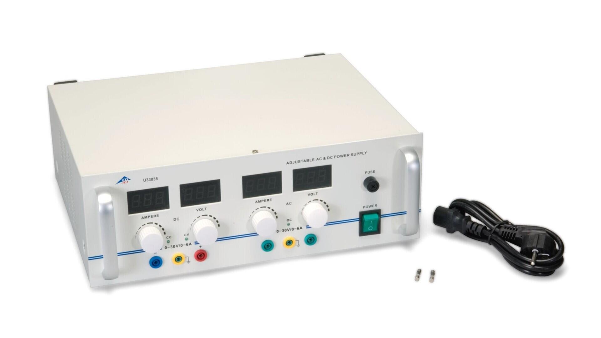 Kombineret strømforsyning med separate AC- og DC-udgange og separate displays for udgangsspænding og -strøm. DC-udgangen kan bruges som spændings- eller strømkilde og indstilles frit i sit område. AC-udgangen har strømbegrænsning og elektronisk overbelastningsbeskyttelse. Tilsluttes med laboratorieledninger, 4 mm bananstik. Metalkabinet. Indstillingsnøjagtighed 0,1 V. DC: 0–30 V, 0–6 A. AC: 0–30 V, maks. 6 A. Mål: 380 × 140 × 300 mm. Vægt ca. 12 kg.