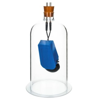 Vakuumklokke i akryl. Anvendes sammen med pumpeplade (varenr. 129335) og vakuumpumpe (varenr. 117837). Manometeråbning i toppen. Den nederste flange er slebet for at tætne mod pumpepladen. Leveres med elektrisk ur til eksperimenter.
