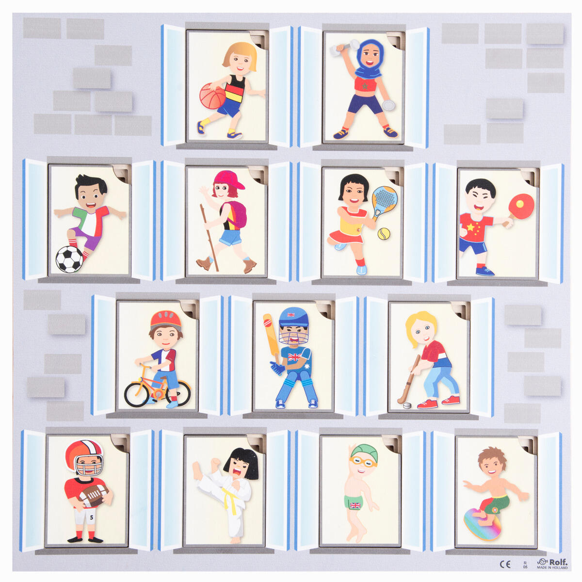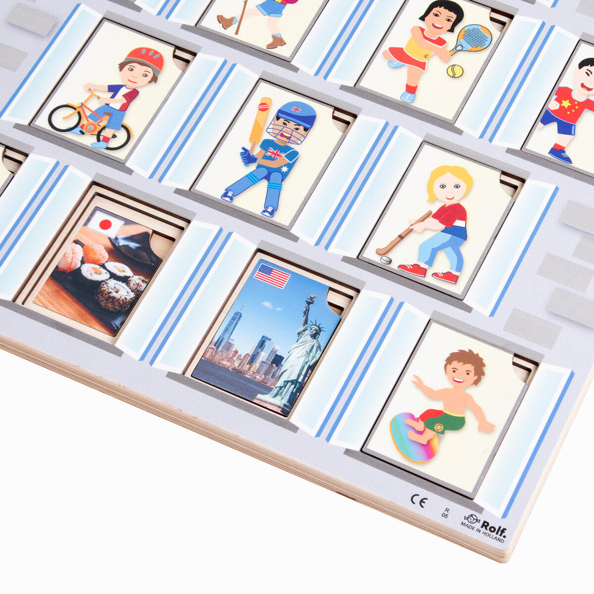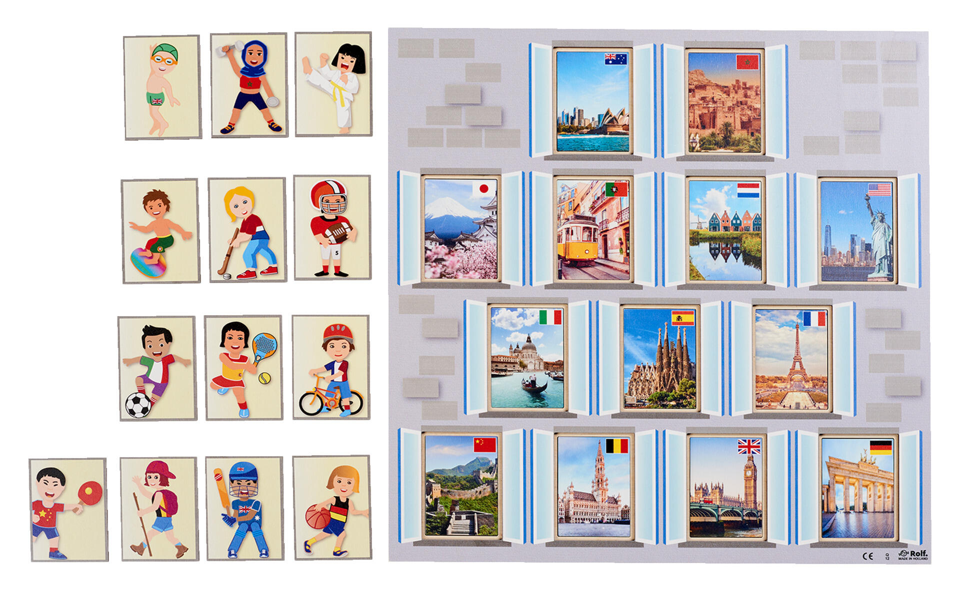 39 puslespilsbrikker. 13 sporty børn fra forskellige lande bor i dette hus. Hvilket land kommer de fra? Match de rigtige puslespilsbrikker med flagene. Oplev bygninger og lækre retter fra de forskellige lande. Mål: 37,5 x 37,5 cm. Materiale: birk. PVC-fri. Fra 4 år.