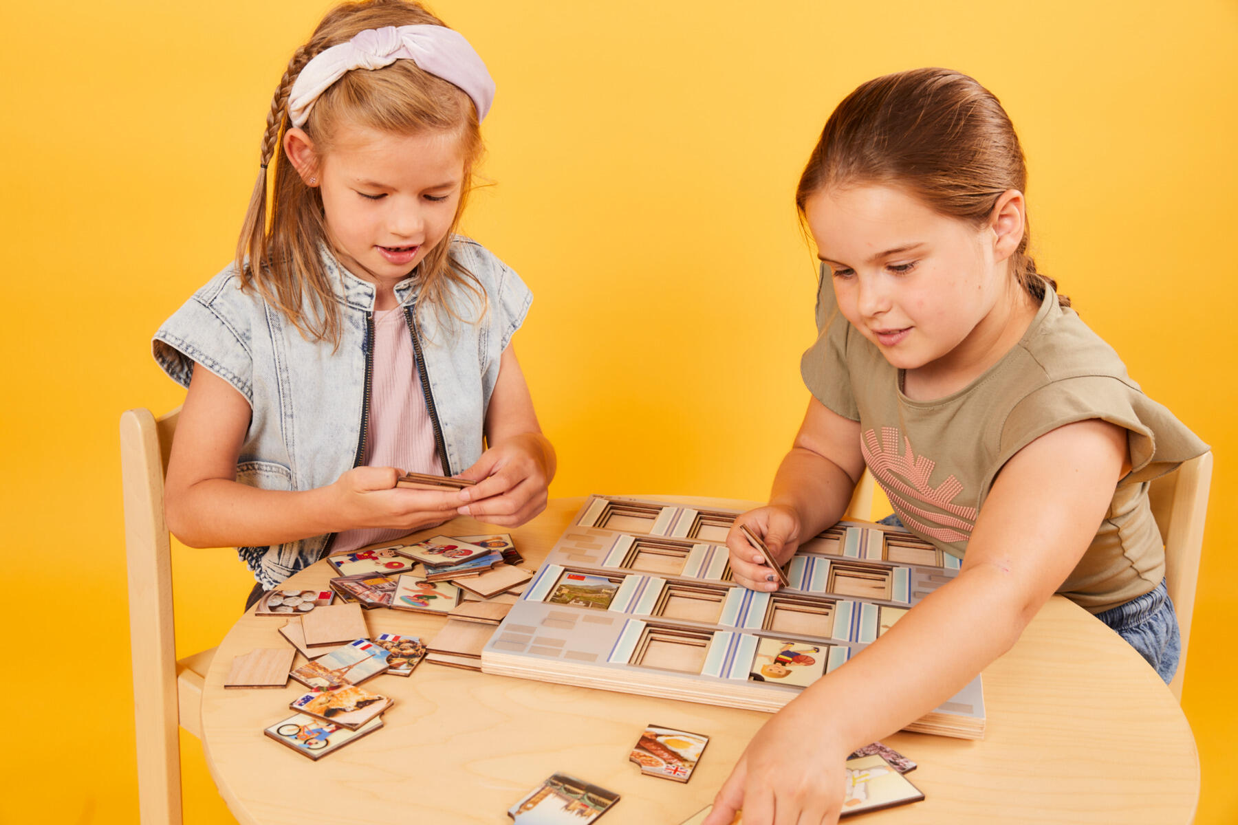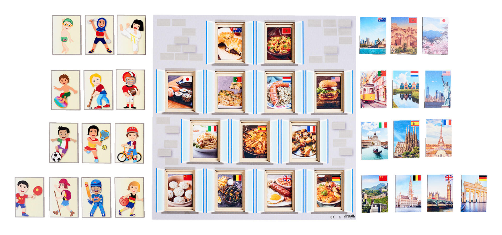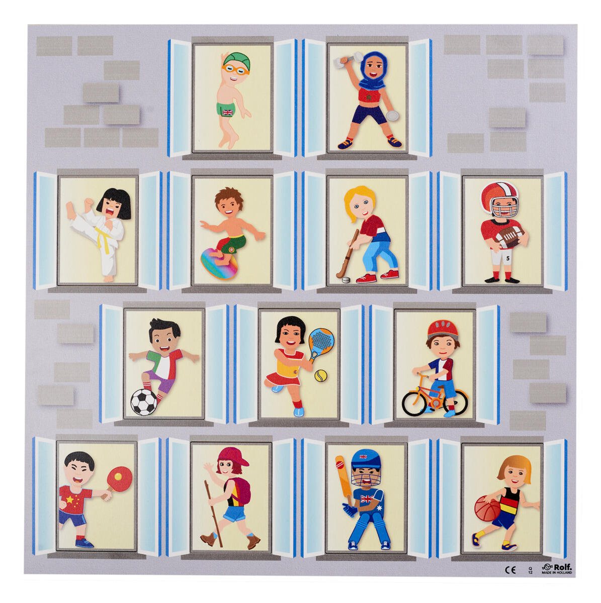 39 puslespilsbrikker. 13 sporty børn fra forskellige lande bor i dette hus. Hvilket land kommer de fra? Match de rigtige puslespilsbrikker med flagene. Oplev bygninger og lækre retter fra de forskellige lande. Mål: 37,5 x 37,5 cm. Materiale: birk. PVC-fri. Fra 4 år.