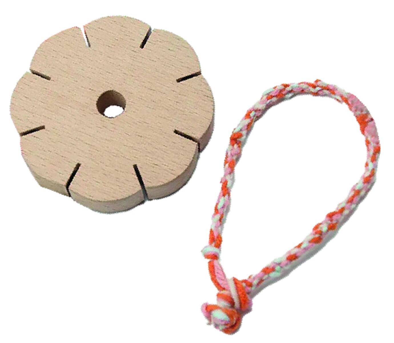Lav nemt et venskabsarmbånd eller anden garndekoration med denne fletteblomst i træ. Fremmer koncentration og finmotorik. Mål: 75 x 75 x 10 mm. Fremstillet i bøgetræ. PVC-fri.