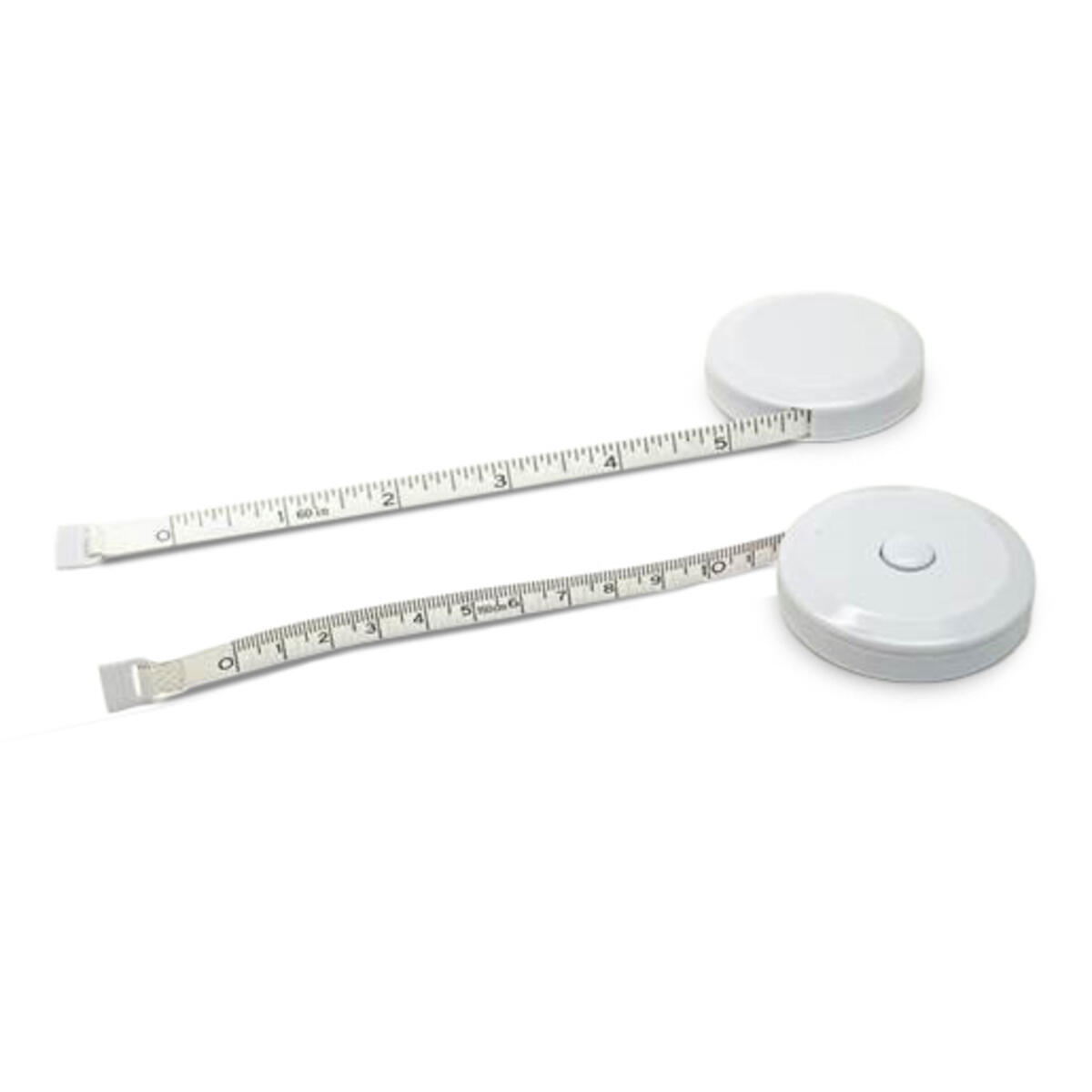 Målebånd med cm og tommer. Længde 150 cm, bredde 7,5 mm. Bånd i TPR, plasthus i ABS. PVC-fri.