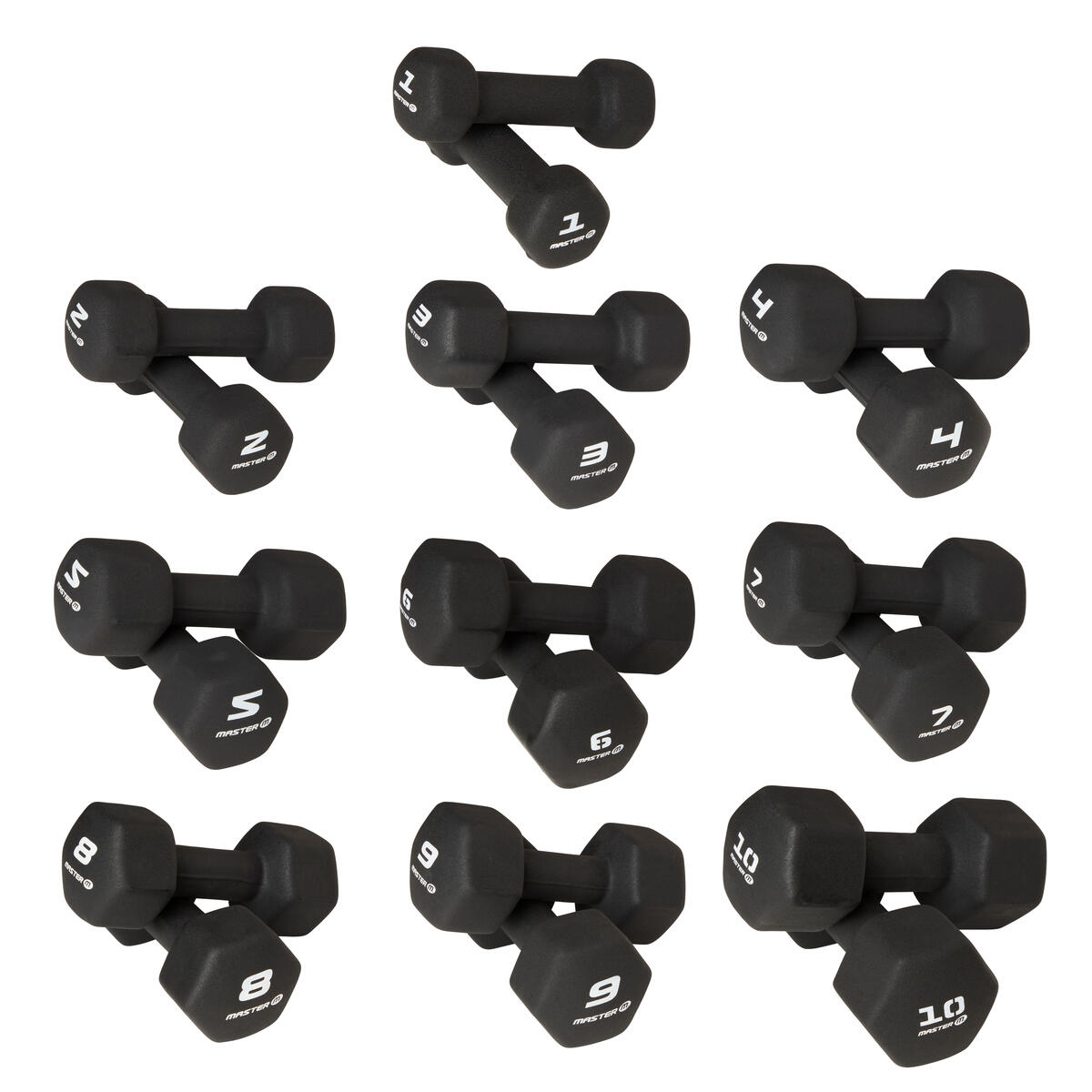 Solide jernhåndvægte, som er helt beklædt med behagelig neopren. Det gør håndvægten meget slidstærk og giver et godt og fast greb, når man træner. Håndvægtens form sikrer, at den ikke ruller væk og passer derfor også godt som fx push-up bar. Sættet indeholder par med vægtene 1-10 kg.