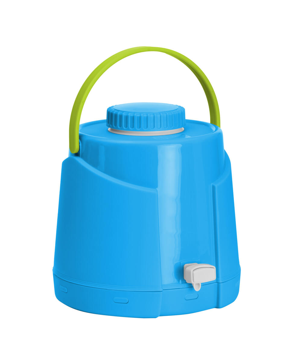 Praktisk opbevaring af drikkelse til udeaktiviteten. Kan også bruges til varme drikke. Nem at rengøre. Rummer 7,5 liter. Mål: Højde 33 cm. Ø24 cm. Af PP, PU og PE.