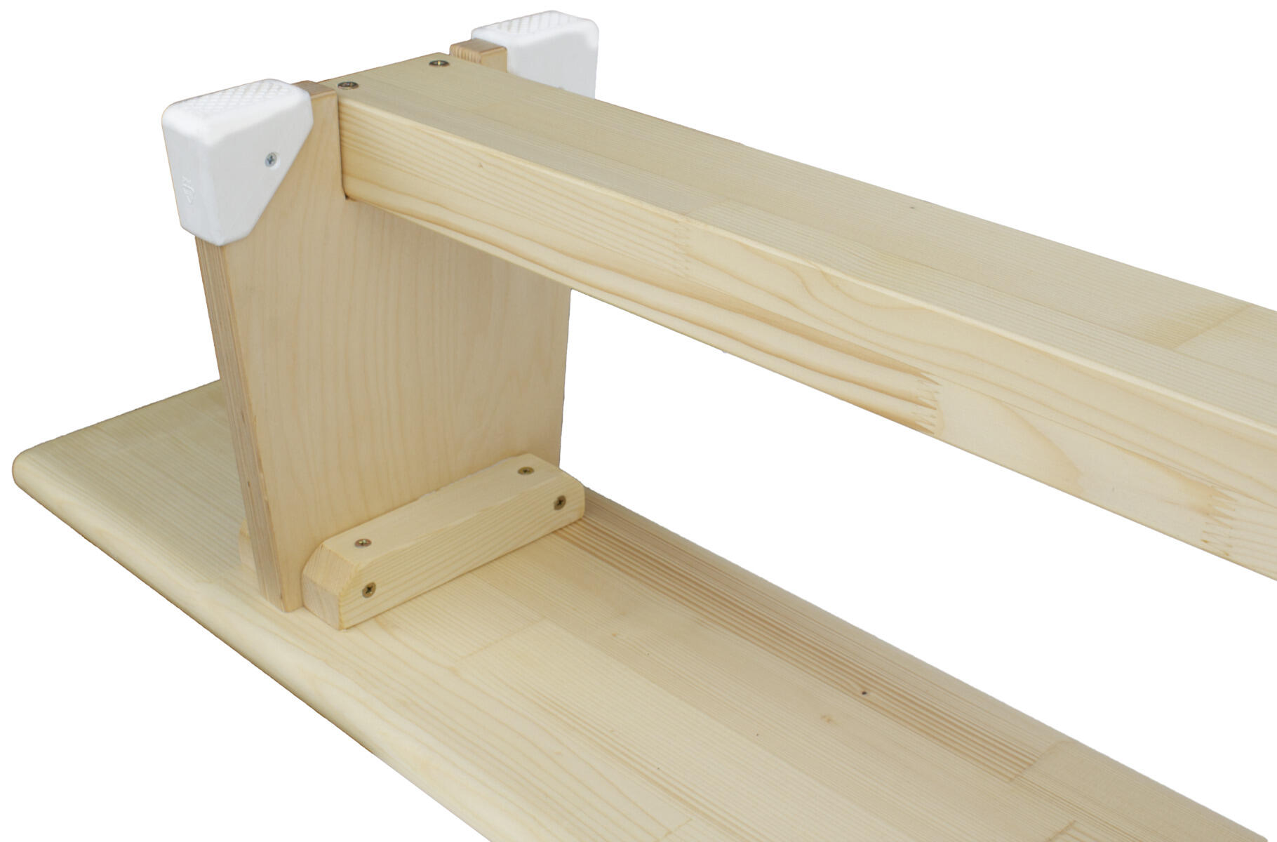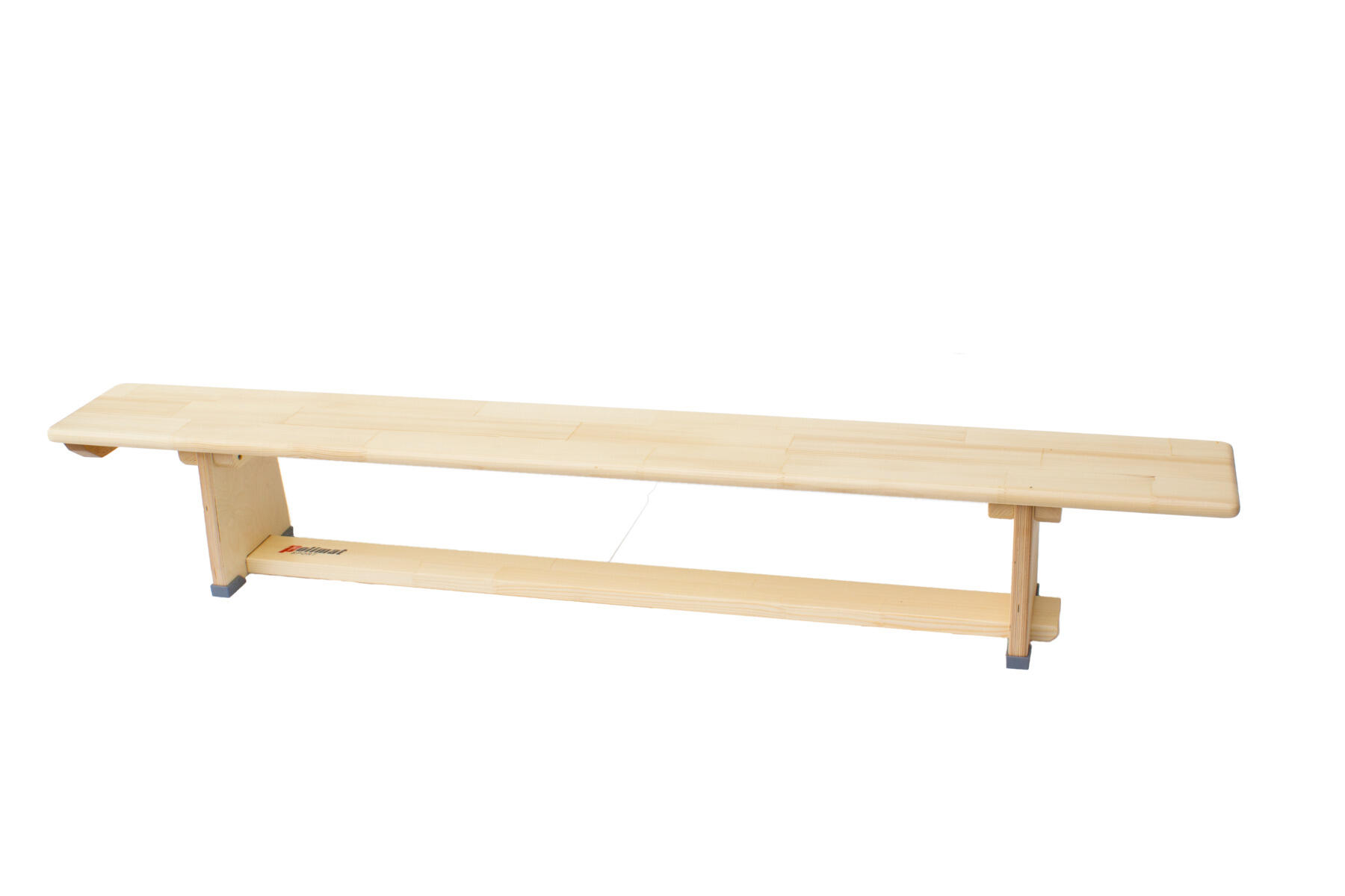 Gymnastikbænk af limtræ. Ben og midterstøtte er fremstillet af slidstærk krydsfiner, og fødderne er af gummi, som ikke efterlader mærker. Alle kanter på top, bjælke og ben er afrundede. Bænken har en krog, så den kan hænges på en ribbe eller i åbningen på en plint. Når bænken vendes, kan bænkbjælken (100 mm bred og 30 mm tyk) bruges til balanceøvelser. Alle dele er lakeret med slidstærk, vandbaseret lak. Bænkepladens mål: 3 cm tyk, 25 cm bred. Højde: 31 cm. Bænken opfylder kravene i EN 913