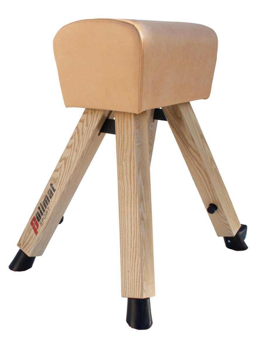 Bukken bruges til at udføre forskellige typer spring. Ben af træ og overdel beklædt med kunstlæder. To af benene er udstyret med hjul for nem transport. Justerbar højde 100-150 cm. Opfylder EN 12196.