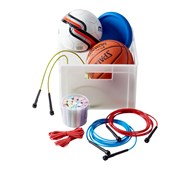 9 dele. Et perfekt sæt til klassen/afdelingen. Leveres i plastkasse og indeholder 1 Spalding streetbasketball str. 5., 1 Mitre fodbold str. 4, 2 sjippetove, 1 buetov, 1 frisbee og 1 pakke udendørskridt i bøtte.