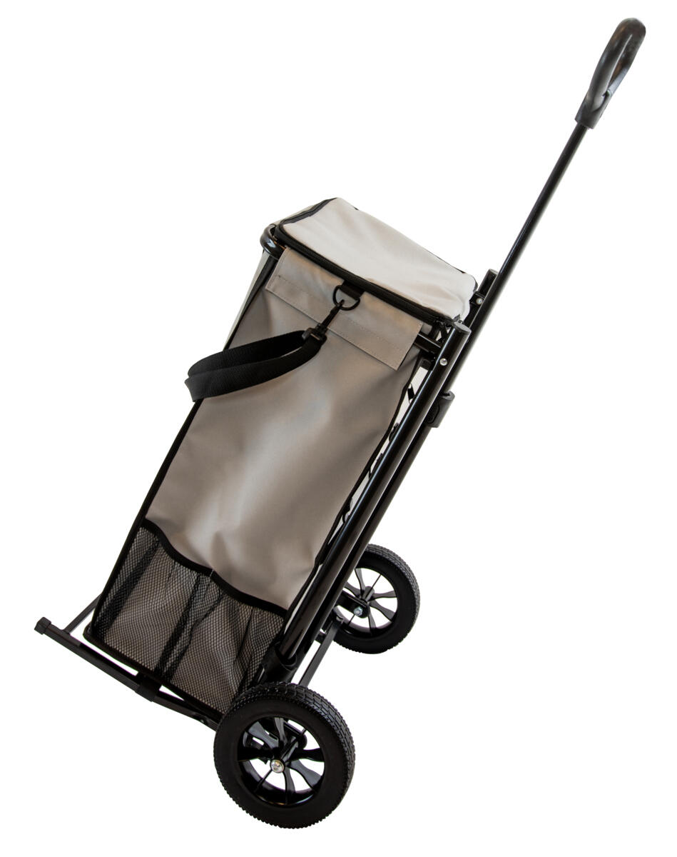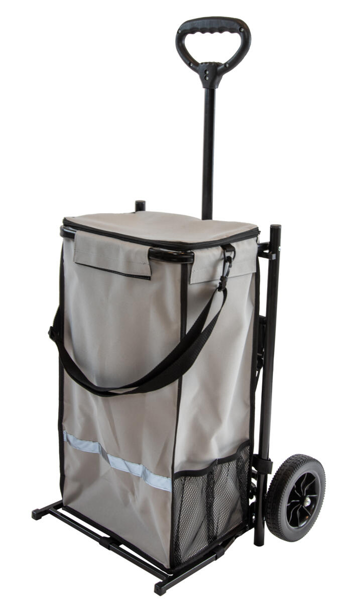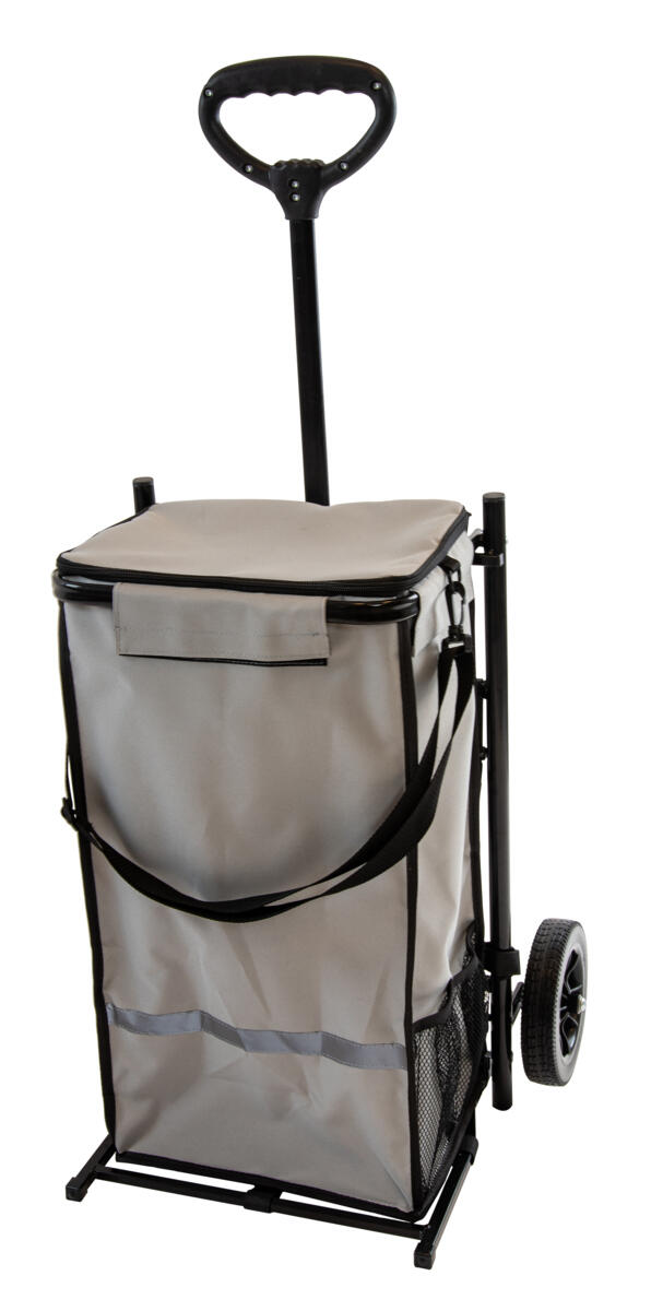 En praktisk vogn med punkteringsfri dæk på kuglelejehjul, som gør den let at trække. Sækken beskytter godt mod regn, har et lukbart låg og kan tages af chassiset og bæres i håndtag eller med skulderrem. Stort pakkerum på 43 l samt en mindre yderlomme foran. Sammenklappeligt aluminiumschassis. Mål: 24x30x60 cm. Hjulstørrelse: 16 cm. Maks. belastning: 50 kg. Håndtagshøjde: 104 cm. Af polyester og PEVA.