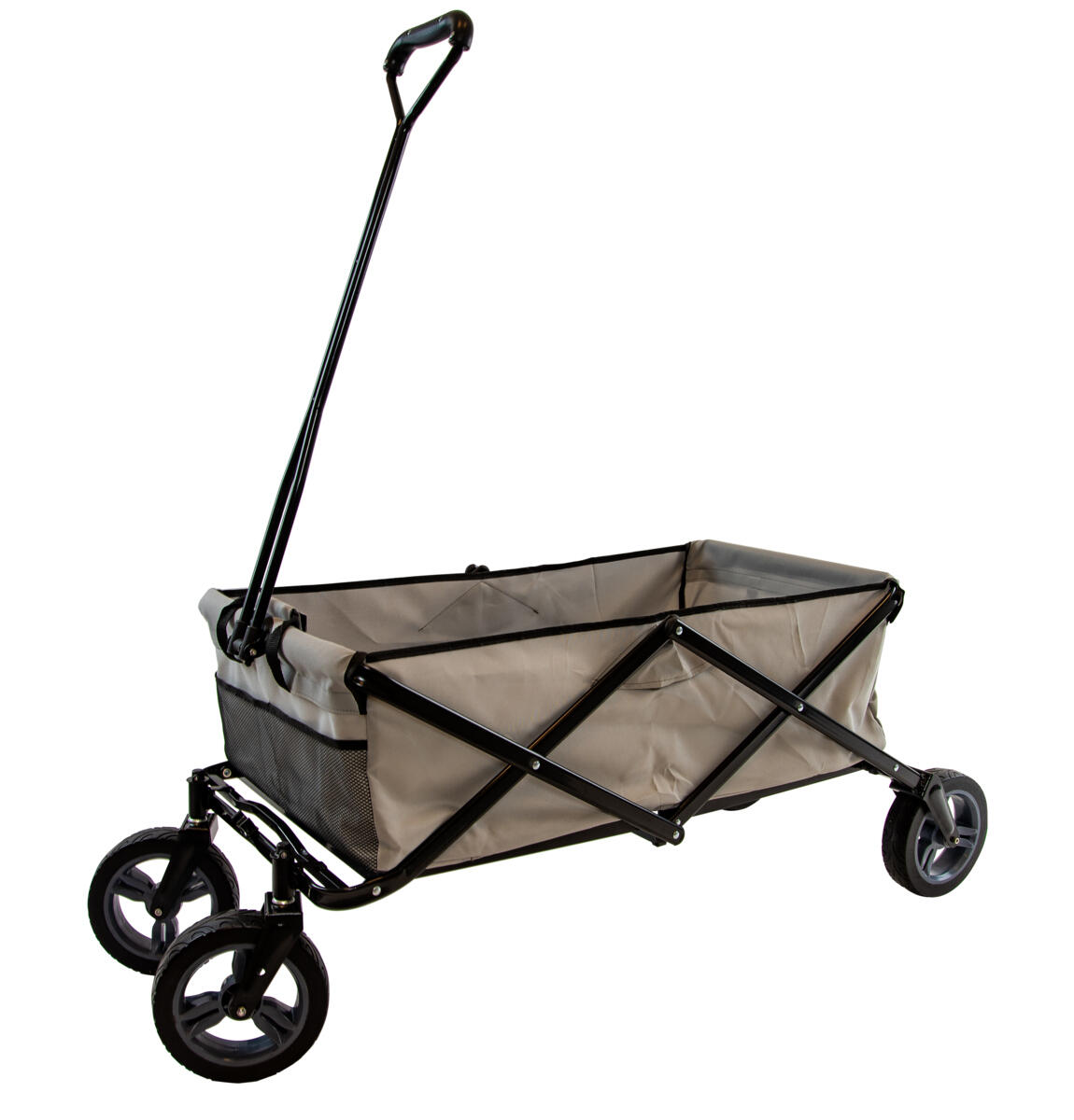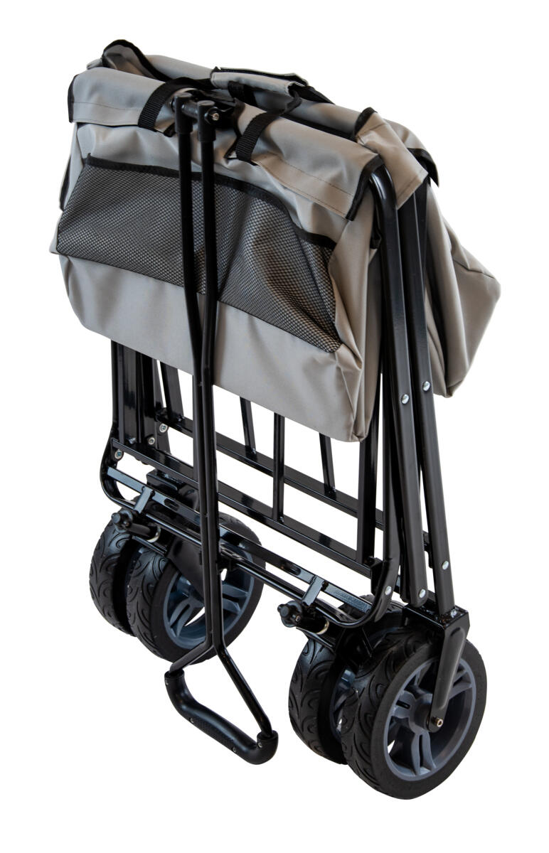 En solid, sammenklappelig trækvogn med en stabil stålramme og slidstærkt stof i polyester, som rummer op til 90 l. Vognen har brede, robuste PU-hjul med bremser, som også er velegnede til ujævnt terræn. Regnovertræk og praktisk opbevaringspose med transporthåndtag medfølger. Vognen leveres samlet og er let at klappe sammen. OBS! Vognen er ikke beregnet til transport af børn. Mål: L95x52xH68 cm, sammenklappet L21xB52xH80 cm. Maks. belastning: 120 kg.