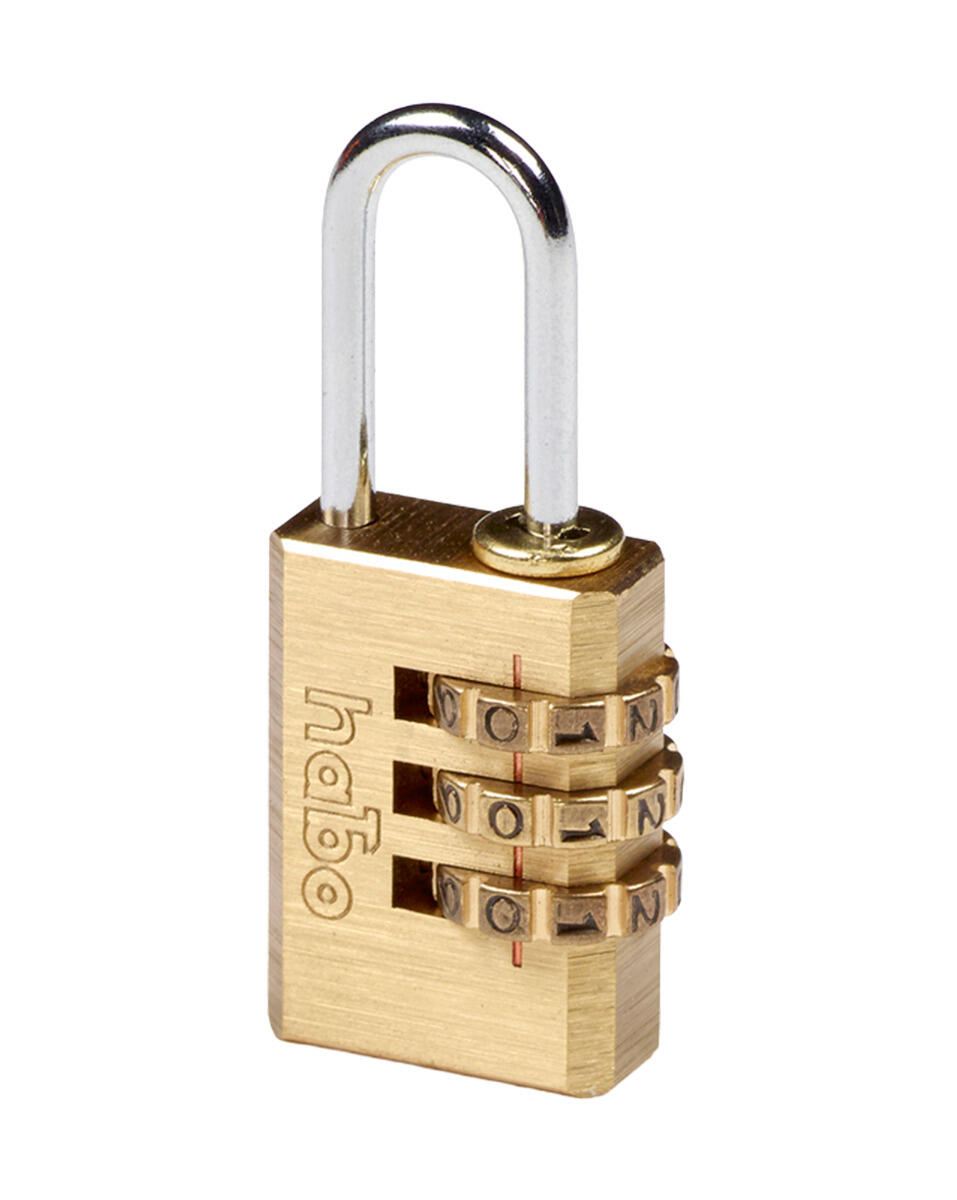 En kombinationslås i messing med 3-cifret låsekombination. Låsehus i aluminium, bøjle i stål. Til indendørs brug. Bøjle Ø3 mm, højde indvendigt 21 mm og bredde indvendigt 8 mm.