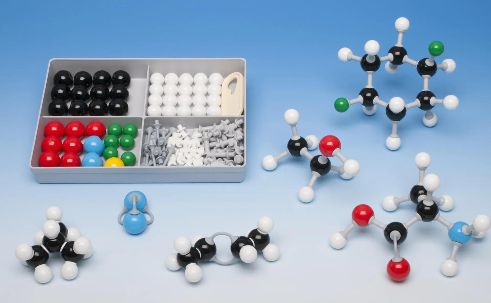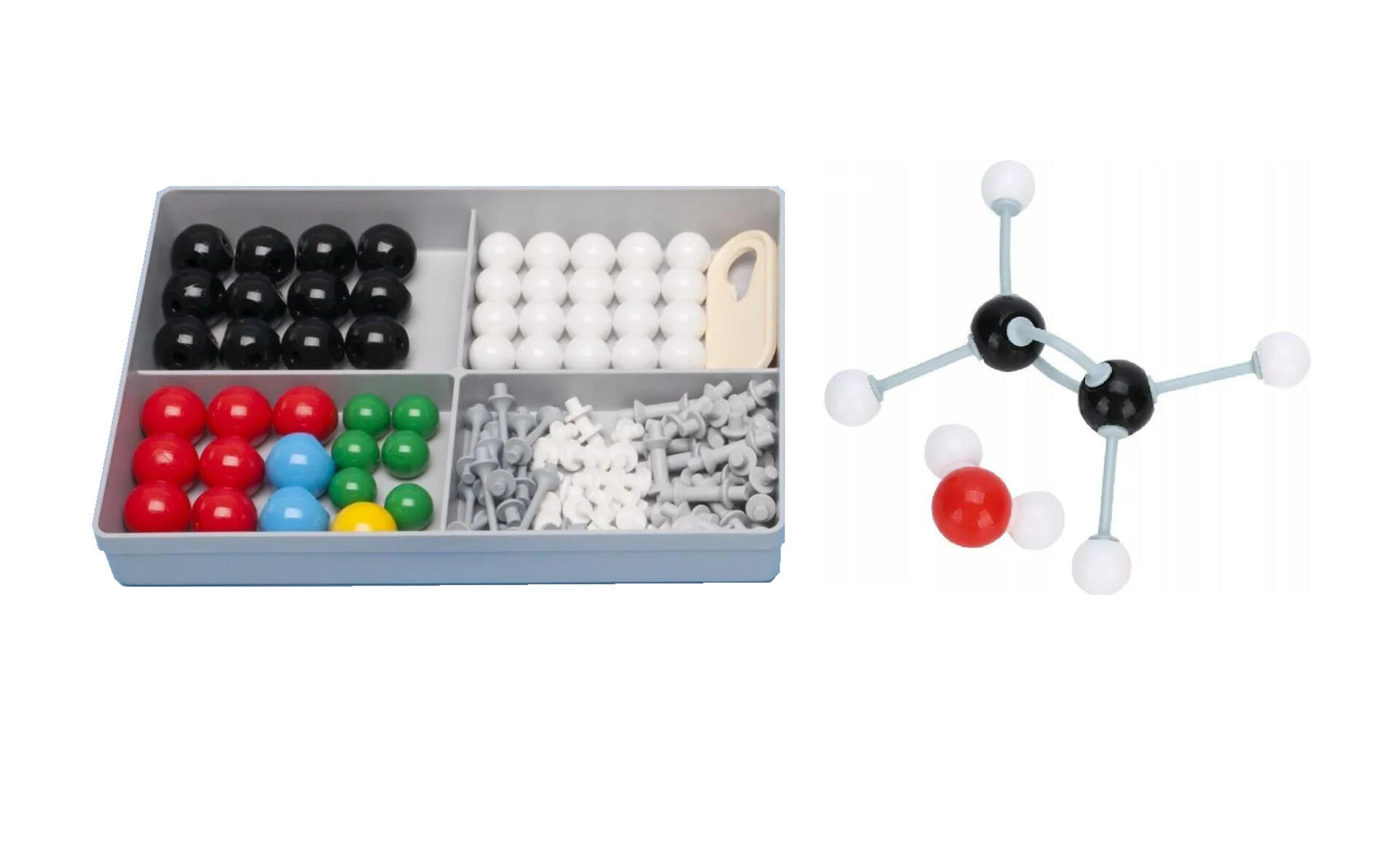 Dette sæt består af de nødvendige materialer til at lave en model af natriumklorid. Det hjælper eleverne med nemt at visualisere strukturer. Består af 13 grå atomer, 14 grønne atomer og 54 bindinger. Til eksperimenter i kemi og fysik.