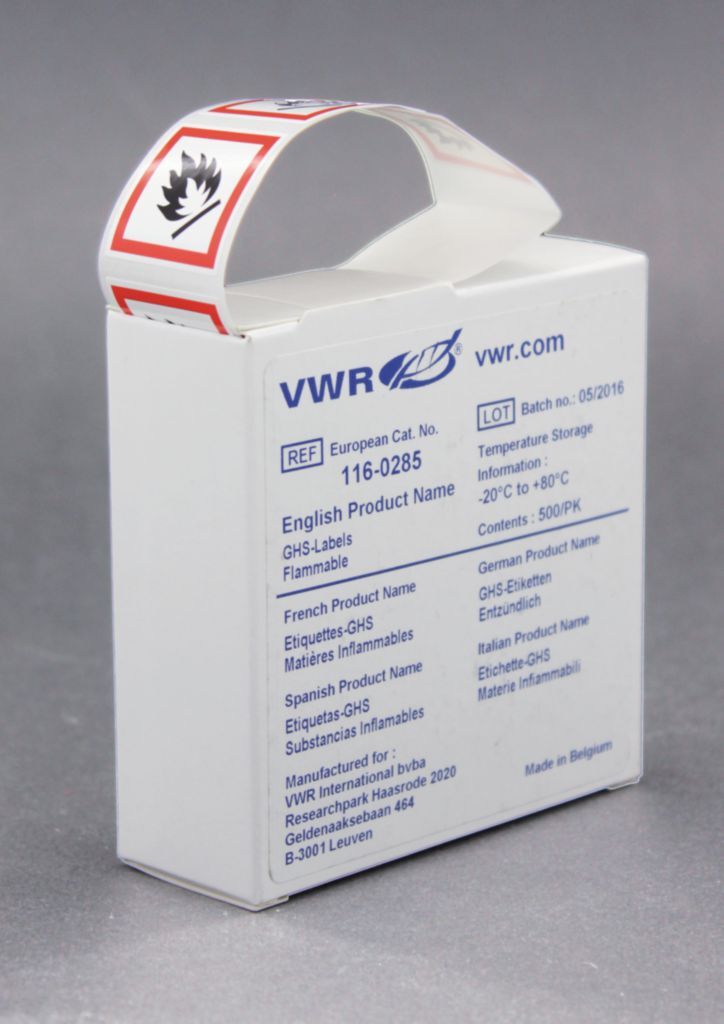 500 stk./rulle. I dispenserpakke med advarselssymbol i henhold til GHS-etiketten "Brandfarlig". Opfylder GHS-reglerne (Globalt Harmoniseret System) for kemiske stoffer og blandinger. Rektangulære etiketter med sort tryk i en rød ramme på hvid baggrund. Mål: 26x26 mm. Af PE-film.