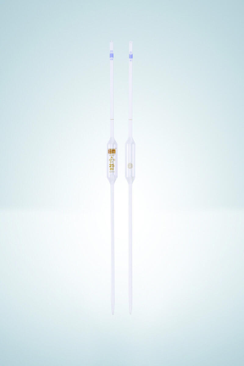 1 stk. volumenpipette 25 ml af AR-Glas®, klasse AS. Kalibreret med brun gradueringsskala. Tolerance: ±0,03 ml. Længde: 520 mm. Certificeret i henhold til DIN EN ISO 648, DE-M-mærkning.