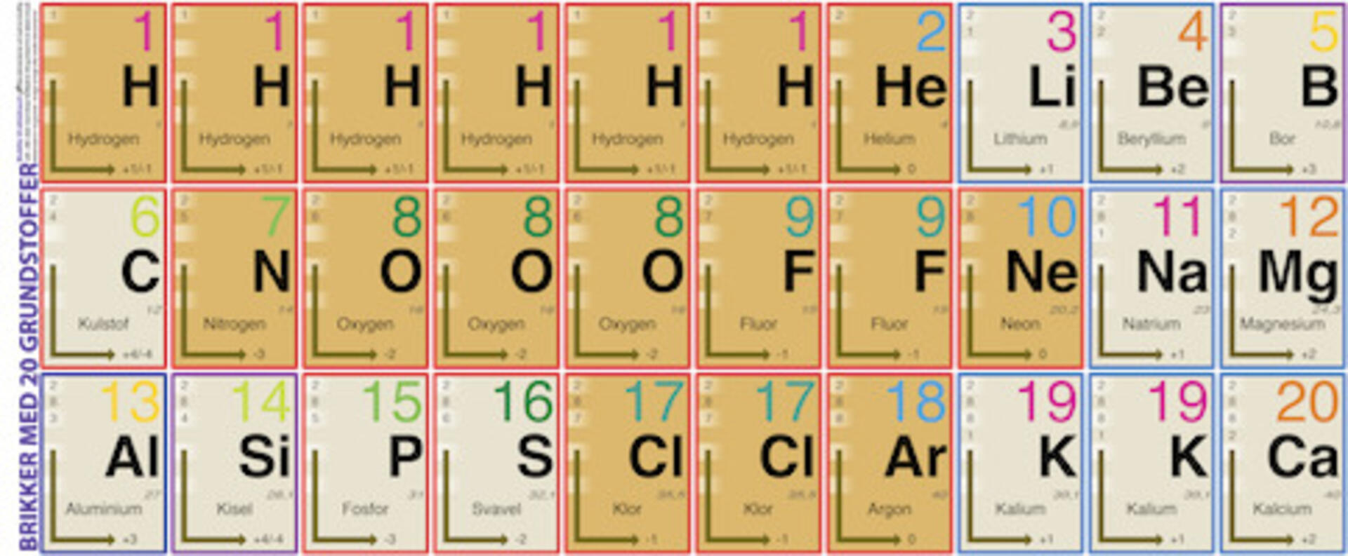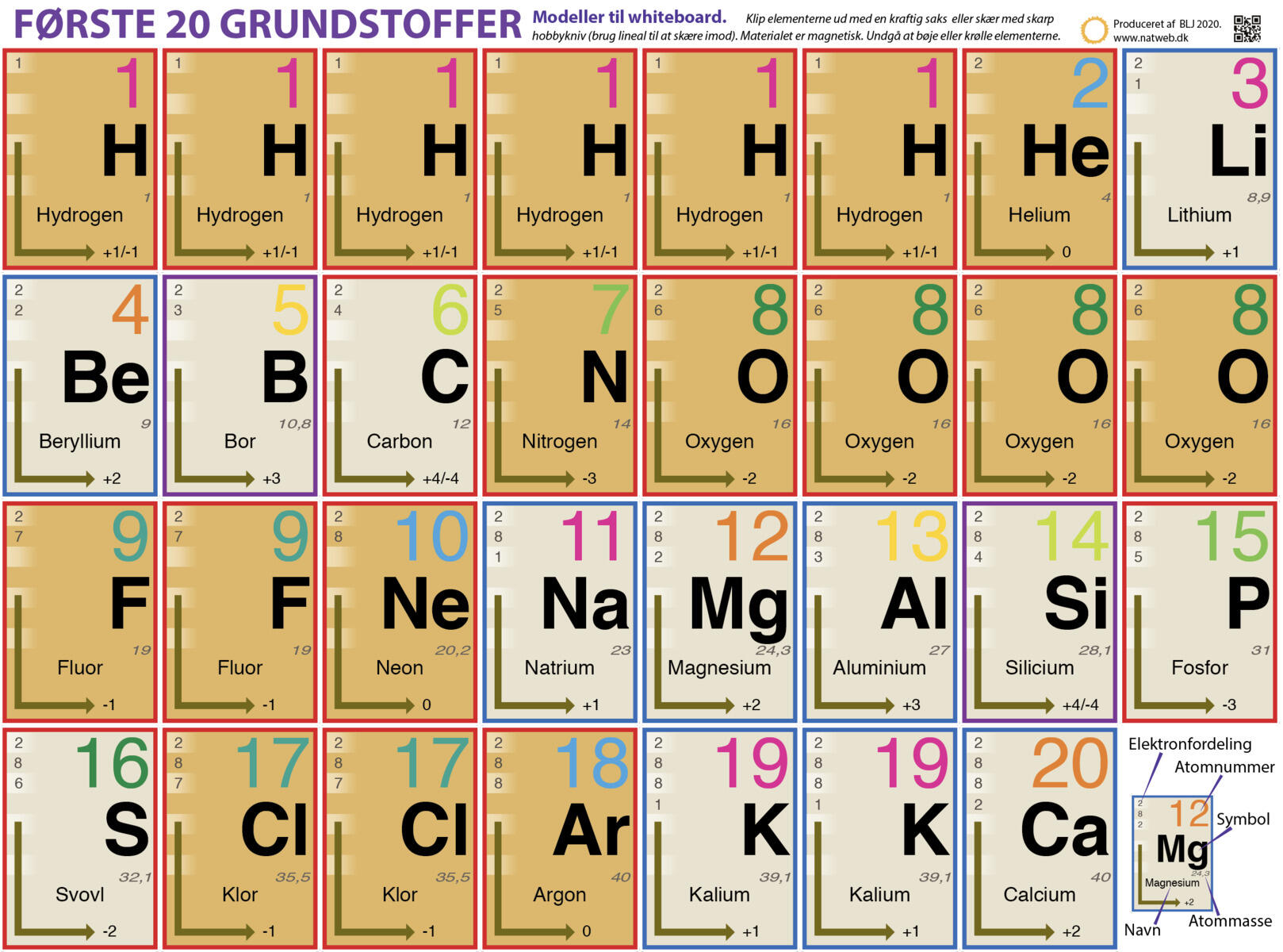 Lad eleverne arbejde med et udvalg af grundstoffer. Byg den første enkle model af det periodiske system, eller vurder hvilke grundstoffer der kan reagere med hinanden. Drøft betydningen af grundstoffernes placering i det periodiske system, og om de enkelte grundstoffer har tendens til at afgive eller optage elektroner. Materialet er magnetisk, så det kan bruges på fx en whiteboardtavle. Sættet, som du selv klipper ud, består af 20 grundstoffer (nr. 1-20). 5 C, 3 O, 2 F, 2 Cl, 2 K og en kopi af de øvrige grundstoffer. Højden på brikkerne er ca. 15 cm. Brug molekylmodellen på tavlen, mens du forklarer, tegner og skriver. Eller lad eleverne arbejde med deres egne molekylemodeller og støtte dem i at udvikle deres modelleringsfærdigheder. Du kan med fordel kombinere denne model med den magnetiske molekylemodel med varenr. 164481.