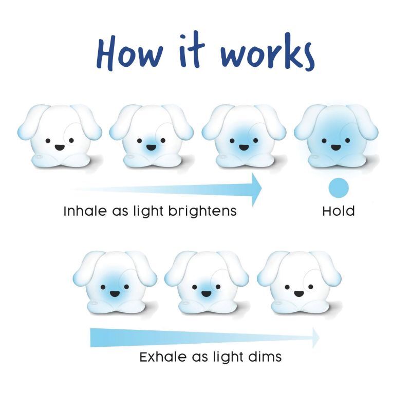 En hvalp, der beroliger ved hjælp af vejrtrækningsøvelser. Sammen med den bliver børnene bevidste om deres tanker og følelser. Tre forskellige vejrtrækningsmønstre: kvadratisk vejrtrækning, 4x4-vejrtrækning og stigende vejrtrækning. Afgiver et blødt lys i 5 forskellige farver. Oplades med det medfølgende USB-kabel. Materiale: Fremstillet af HIPS og PVC uden forbudte ftalater. Mål: 13x10x10 cm. Fra 3 år.