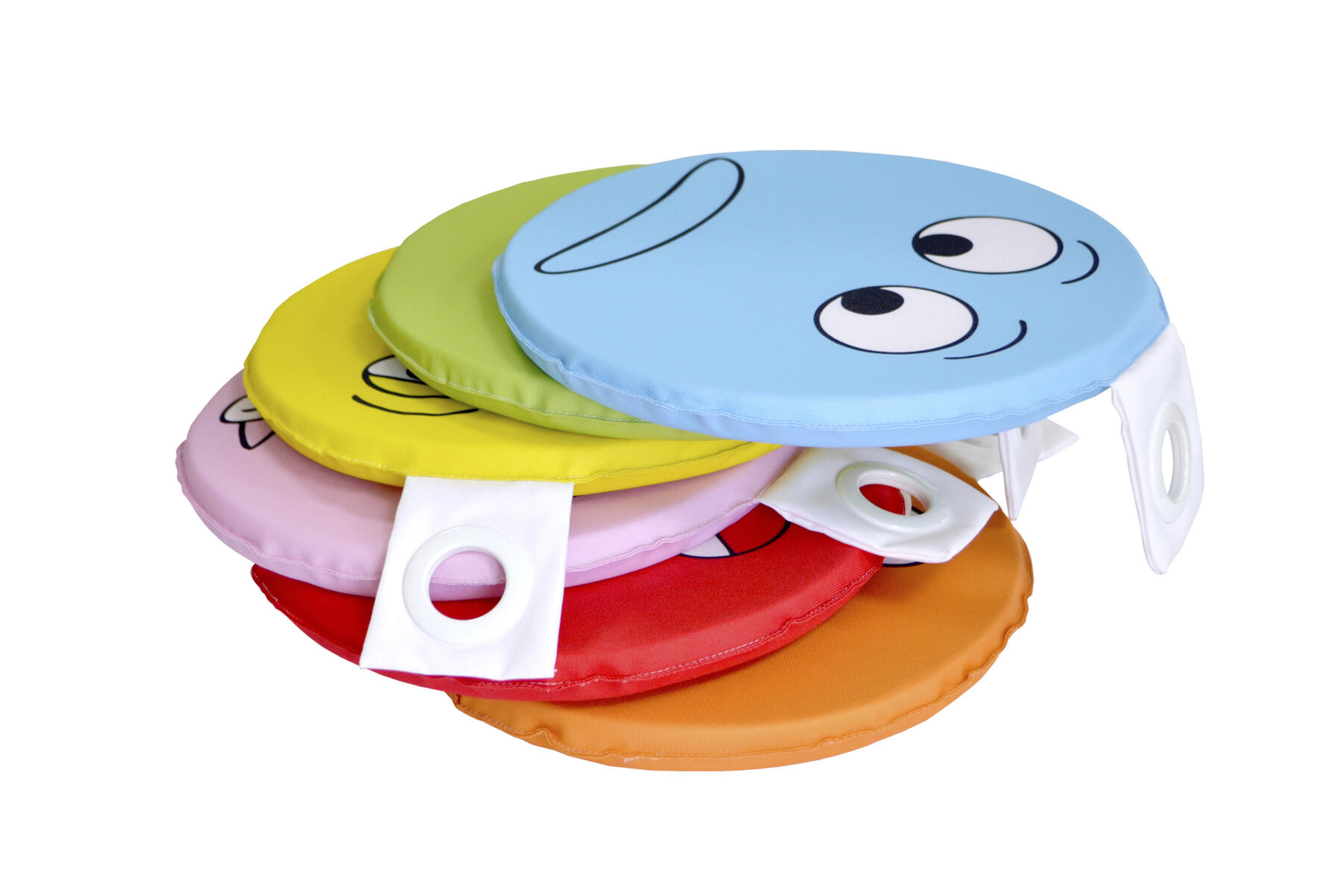8 stk./pk. Med 4 forskellige farver med tryk. Puderne passer fint til samling eller på en stol. De er gode at sidde på og har en skridsikker underside. De sjove tryk opmuntrer barnet til bevægelse og aktivitet. Ø39,5 cm.