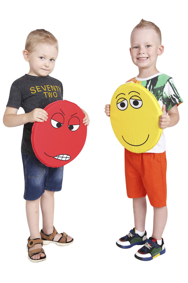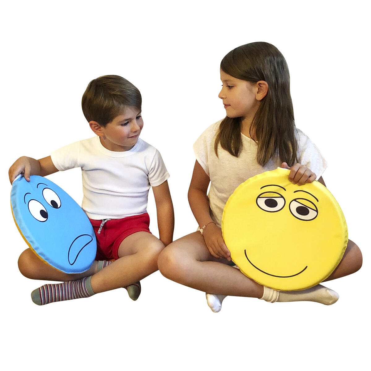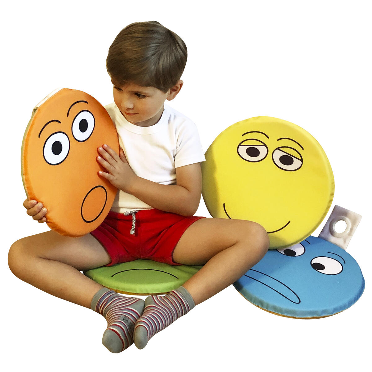 Disse 6 siddepuder er gode at bruge, når man skal lære forskellige følelsesmæssige udtryk og formidle dem. Hver pude viser en af de 6 universelle følelser: Synd, glæde, sorg, frygt, overraskelse og afsky. Puderne kan ligge på gulvet eller hænge på væggen. Mål: 32 cm.