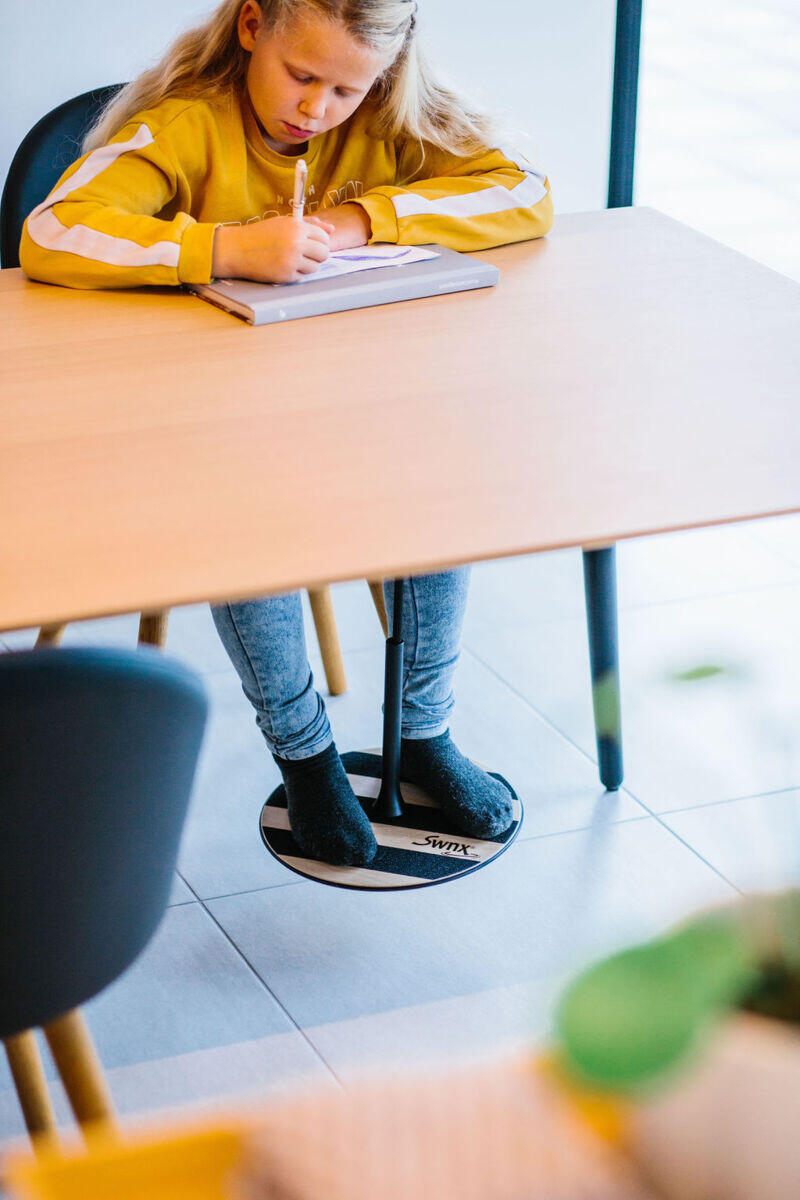 SWNX® fodgynge er specielt udviklet til børn og unge med motorisk uro, som har problemer med at sidde stille. SWNX® giver mulighed for at bevæge ben og fødder uden at forstyrre andre. Gyngen er lydløs og ude er syne under bordet. Fodgyngen er med til at forbedre siddestillingen og gøre den mere ergonomisk. Modellen SWNX® One School med en diameter på 31 cm er velegnet til børn fra ca. 7 år og voksne. Højden på fodgyngen kan justeres enkelt og trinløst. Beslaget er designet, så fastgørelsespunktet kan indstilles lidt fremad eller bagud, så det passer til forskellige kropslængder. Pladen er lavet af hård plast med elementer af blødere plast, der forhindrer fødderne i at glide. SWNX® fodstøtte fås også i en mindre model og i træ. Beslag og skruer til montering medfølger. Tykkelsen på bordpladen skal være mindst 20 mm til montering. Ekstra beslag er tilgængelige, så man nemt kan flytte SWNX® mellem bordene. Robust kvalitet, der holder længe. Designet i Danmark og testet af danske skoler.
