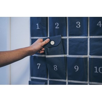 Opbevaringskalender med 30 stk. opbevaringsrum tilpasset til MyPauze mobiletui. Rummene er nummereret 1-30. Opbevaringskalenderen har 4 stk. metalringe til fleksibel ophængning. Slidstærkt mørkeblåt Oxfordstof. Mål: 130x80x0,2 cm.