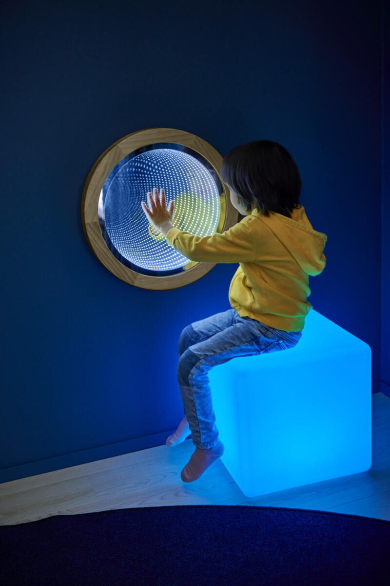 Et roligt, trygt og sensorisk sted for børn, som har brug for at slappe af, finde ro eller udforske. Det er et let telt, som er nemt og enkelt at sætte op. Mulighed for ophæng af forskellige dekorationer i hjørnerne. Da den nedre del af åbningen kan foldes ned, er det også muligt at rulle ind med kørestol. Mål: 142x142x142 cm.