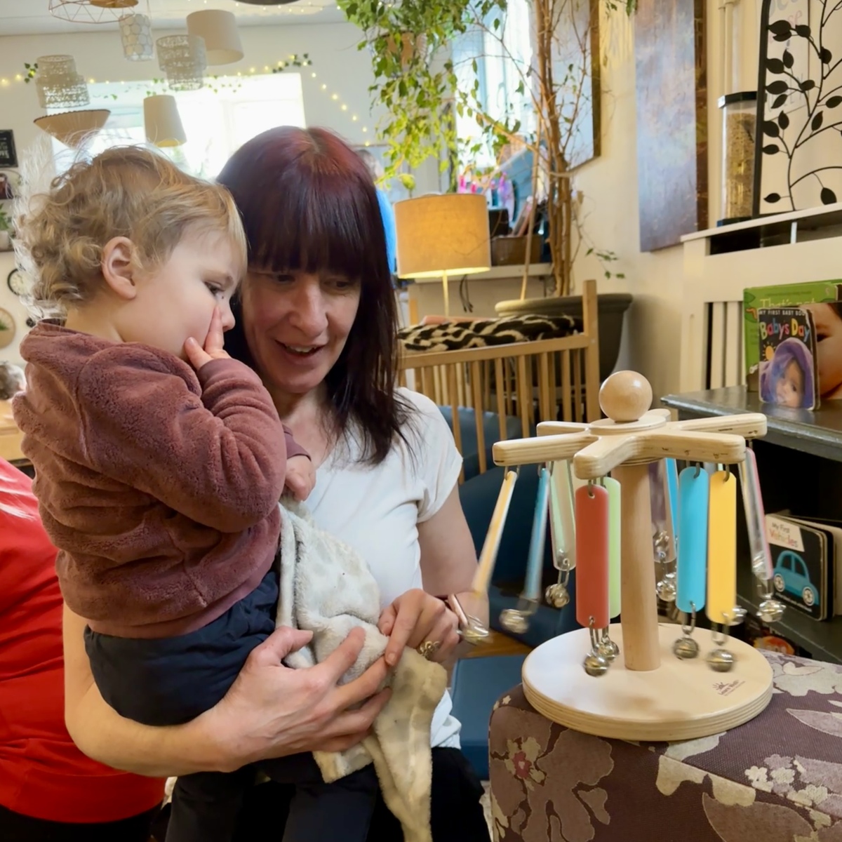 En fascinerende multisensorisk spejlkarrusel, som med spejle og rotation skaber stor effekt. 12 hængende spejle med klokker stimulerer både syns- og høresansen. Spejlene reflekterer farver, lys og omgivelserne tilbage til barnet. Perfekt at tage med ud i sollys og se farverne "danse". Mål: 27x22 cm. Materiale: birk. FSC-certificeret. Fra 3 år.