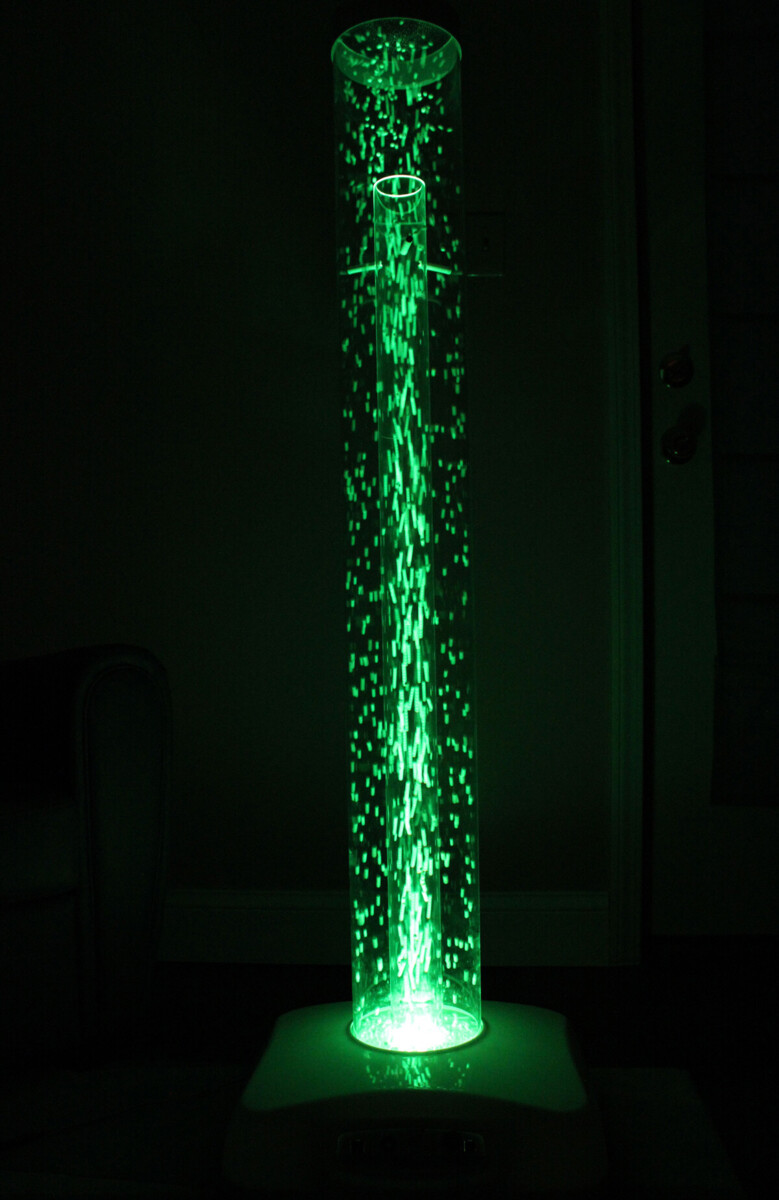 Et lille boblerør, som skifter farve og leder boblerne gennem en søjle bagved og lader derefter kuglerne langsomt synke frem. Giver en meget afslappende oplevelse. Fjernbetjening medfølger. Mål: H60, Ø15 cm.