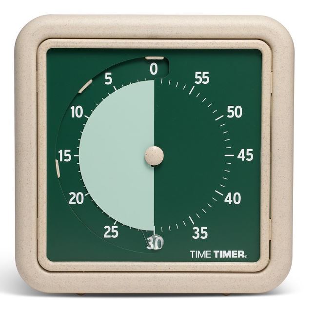 Smart ur, der tydeligt viser, hvor meget tid I har tilbage, eller hvor meget tid I har brugt. Indstil feltet til ønsket tid, fx 30 min., hvorefter feltet mindskes med uret. Kan indstilles fra 0–60 min. Vis “hvor længe der er tilbage” for at fastholde fokus eller brug uret til at mindske konflikter om tur. Tænd/sluk-knap til alarm på bagsiden samt et låg, der kan lægges over for at beskytte urskiven. Mål: 8 x 7,5 cm. Materiale: ABS, PC og PVC.