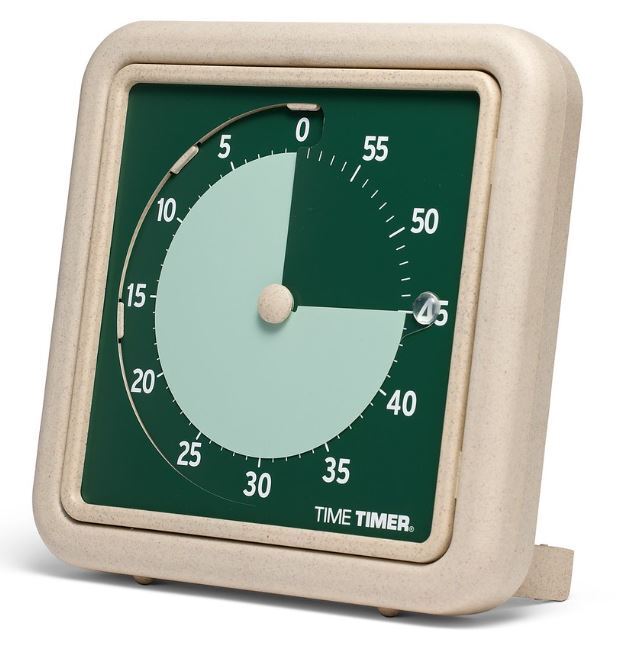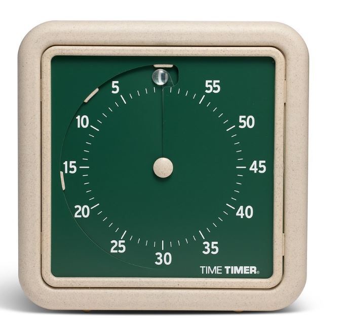 Time Timer Plus 60-minutters har en tydelig visuel rød plade, så man kan se, hvor meget tid der er tilbage. Et håndtag gør det nemt at tage den med. Den har justerbar volumen og beskyttelsesglas. Mål: 14x18 cm.