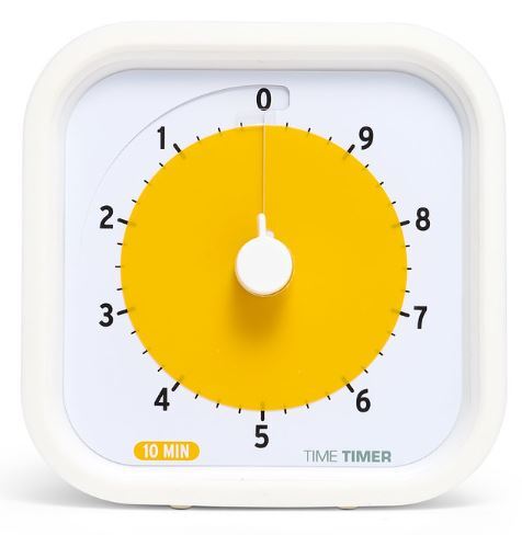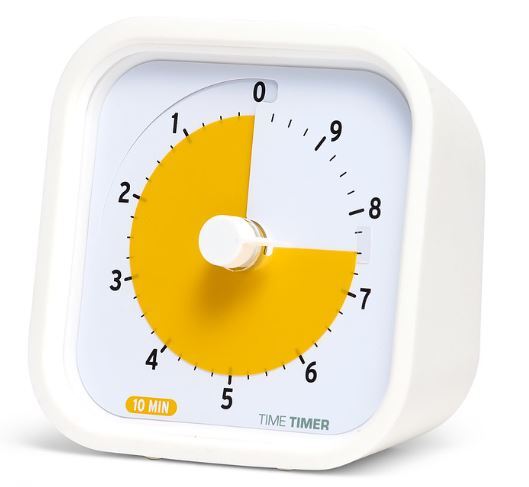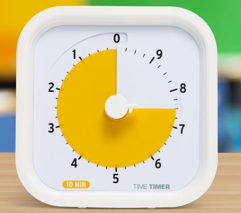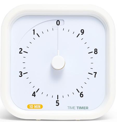 Maksimal tid: 10 minutter. En konkret tidsviser som tydeligt viser, hvor lang tid man har, eller hvor meget tid der er tilbage. Indstil det orange felt til ønsket tid – feltet bliver gradvist mindre med urets retning. Justerbar 0–10 min. Perfekt til små grupper, ved computeren eller ved opgaver med tidsgrænse. 1 stk. AA-batteri kræves (medfølger ikke). Lydløs nedtælling. Tænd/sluk-knap til alarm på bagsiden. Mål: 9x9 cm. Materiale: ABS, PC og PVC.