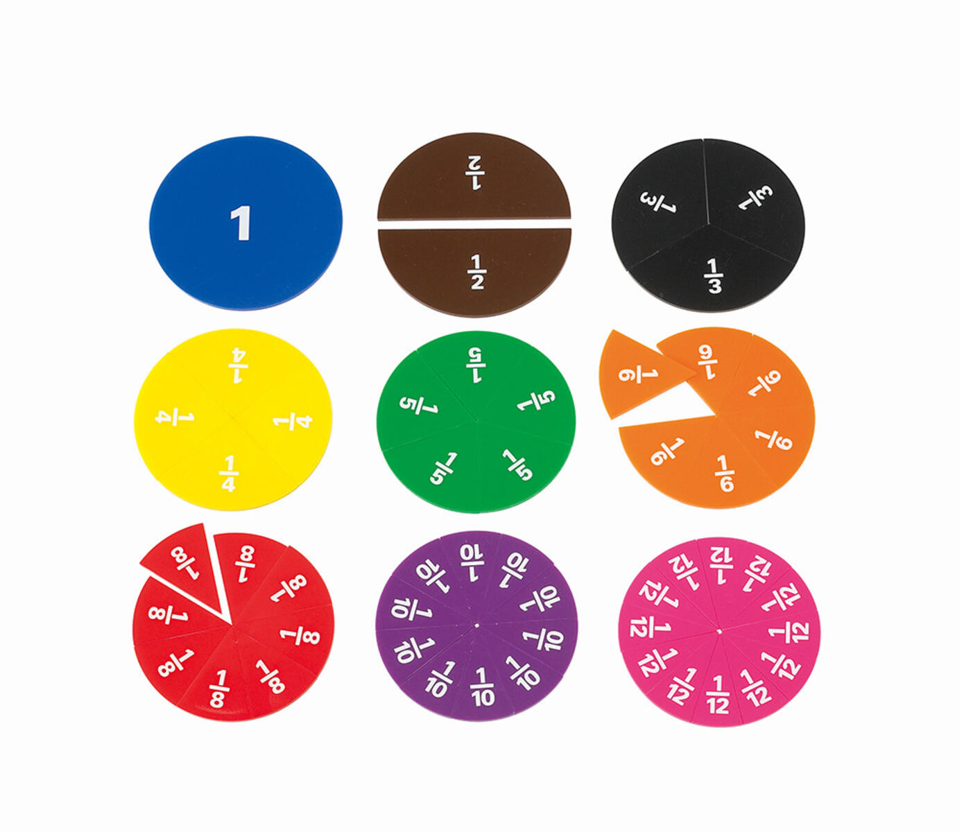 Et fint værktøj til at forstå brøk. Sættet består af 51 dele af brøk. Viser brøkerne 1/1, 1/2, 1/3, 1/4, 1/5, 1/6, 1/8, 1/10 og 1/12 i forskellige stærke farver med brøken påtrykt. Mål: 1/1 er 10 cm.