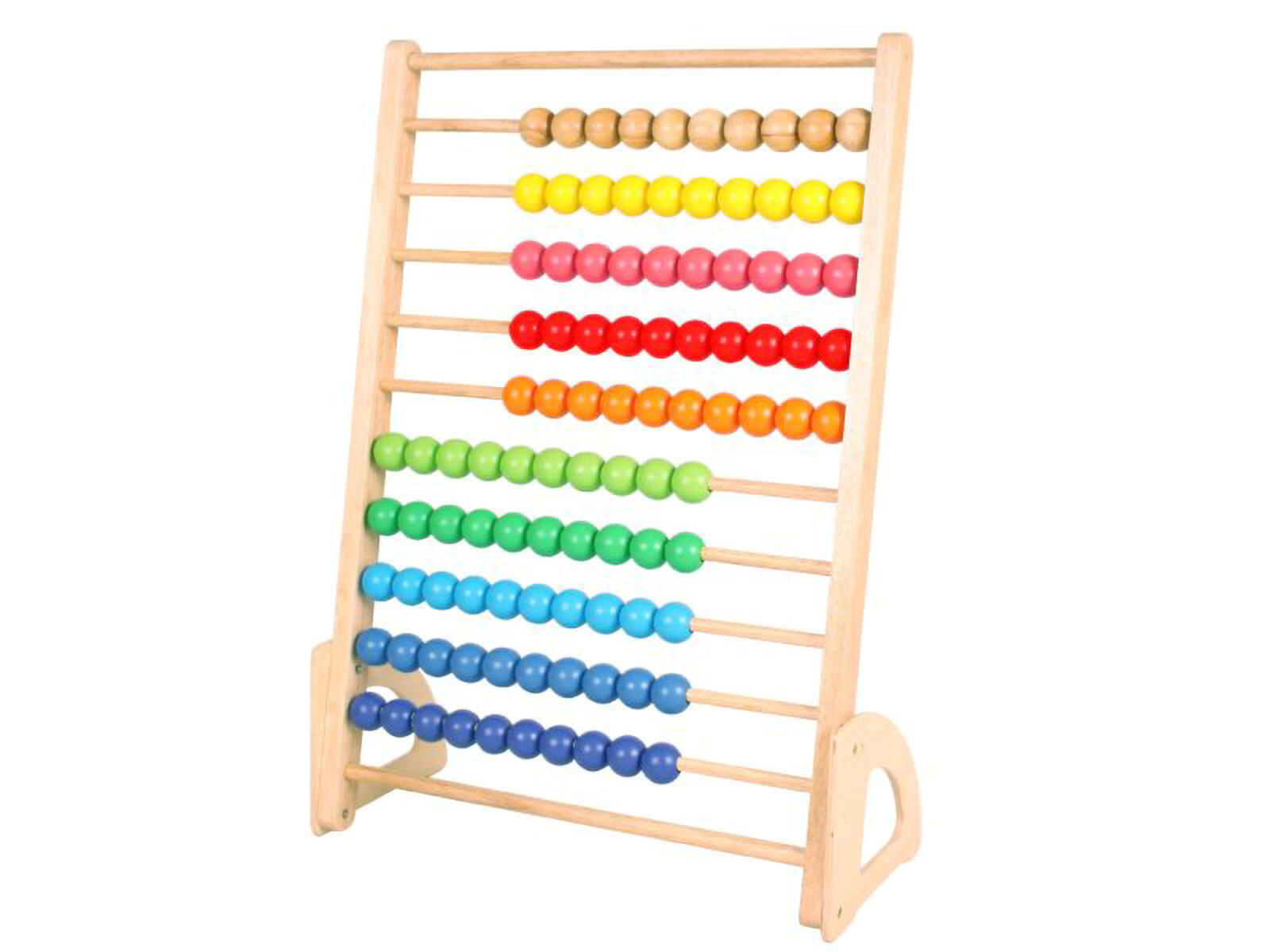 Moderne variant af traditionel kugleramme. Med kugler i 5 farver og tal til at bruge horisontalt og vertikalt på rammen. Mål: 23x15 cm. Af polystyren og polyetylenplast. Fra ca. 5 år.
