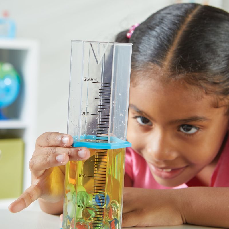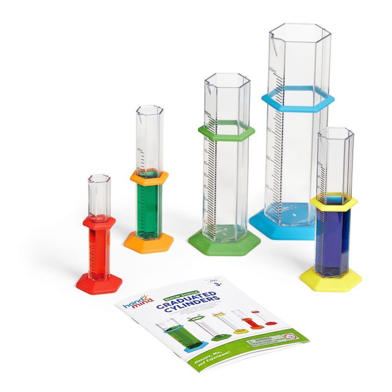 5 stk. Graderede målecylindre med hældetud (10, 25, 50, 100, 250 ml). Hæld, mål og udforsk. Klar, holdbar plast med en krave, der kan skubbes op og ned for at holde styr på niveauerne. Højde: 10,5/13,5/14/16/19 cm høj. Fra 3 år.