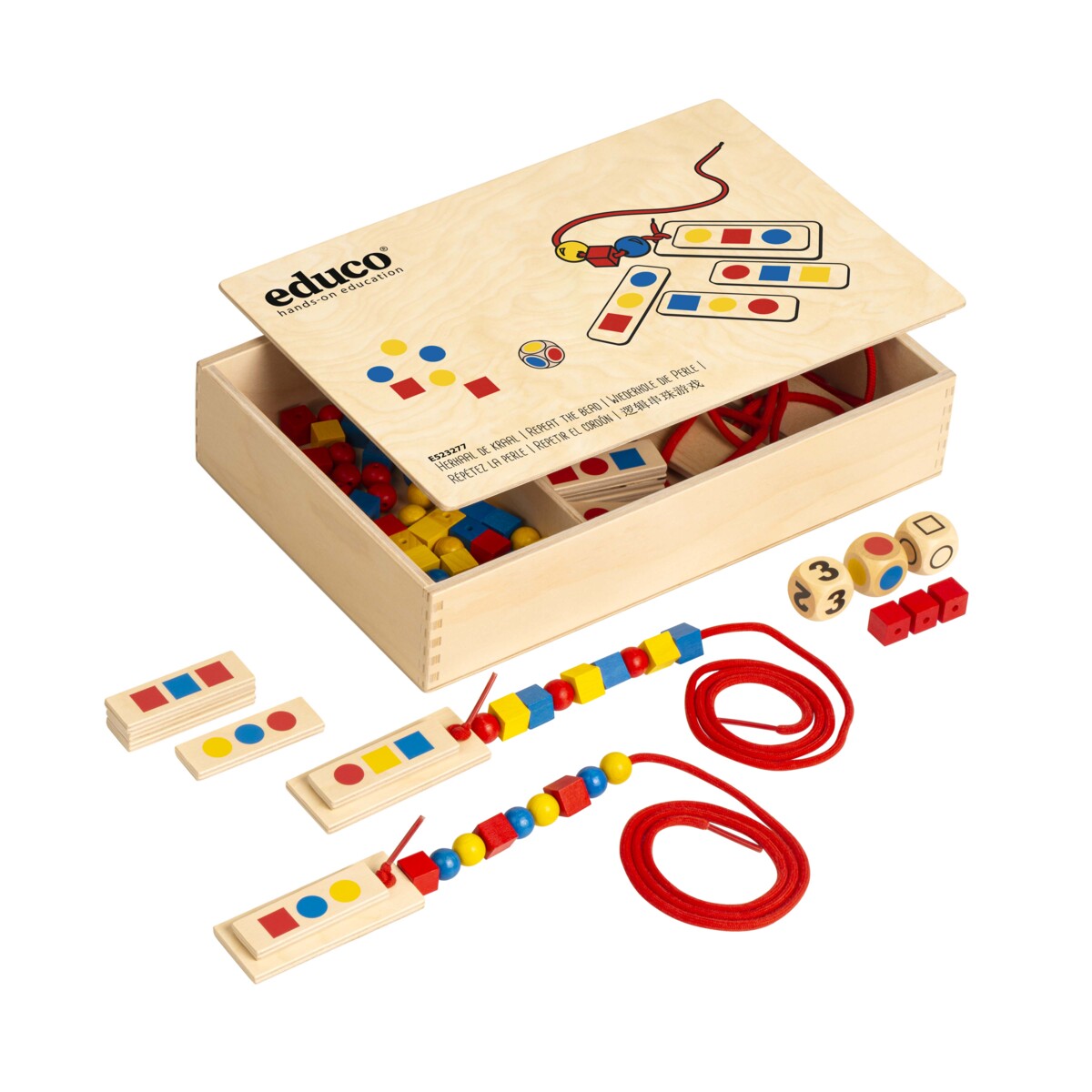 180 plastperler (6 former og 5 farver) sammen med 12 dobbeltsidede aktivitetskort, en kortholder af træ, 4 røde snore og en trækasse til opbevaring. Øv på former, farver, rækkefølge og mønstre. Lav mønstrene som vist på opgavekortene enten ved at bruge stilladset eller den røde snor. De sorte og hvide mønstre lader børnene bruge deres egne farver. Lad børnene også lave deres egne mønstre og øv på at gentage sekvenser. Manual på engelsk inkluderet. Mål på trækassen: 33,5x22,5x7 cm. Fra 3 år.